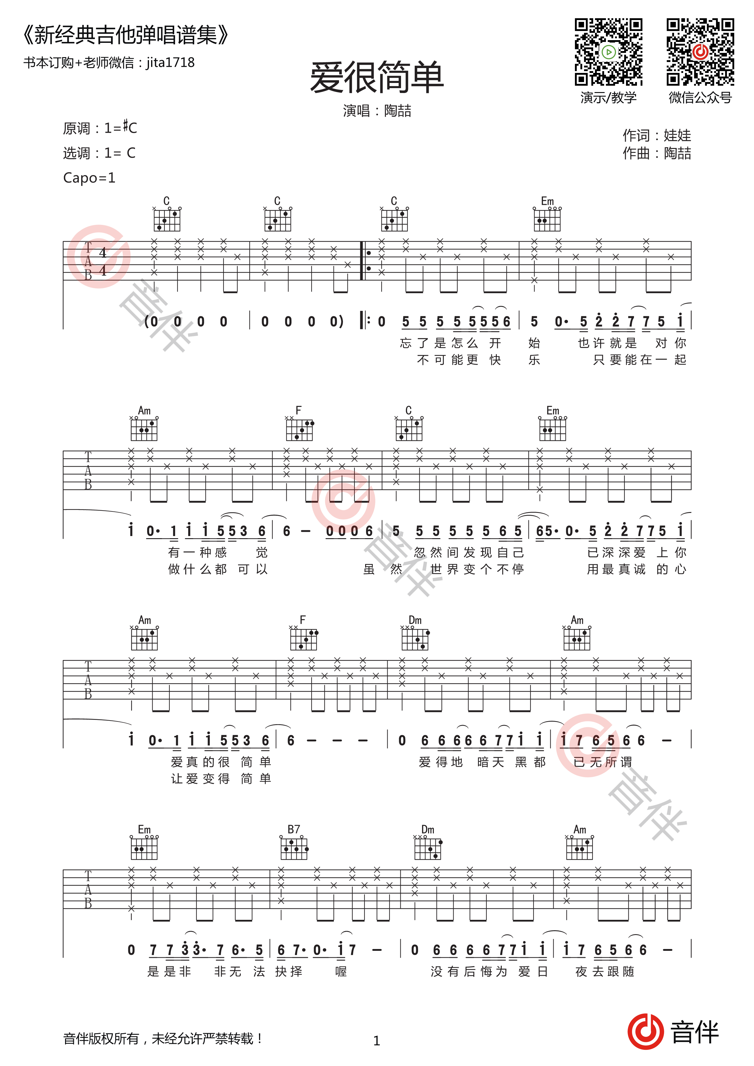 吉他陶喆 《爱很简单》吉他谱- C调弹唱谱