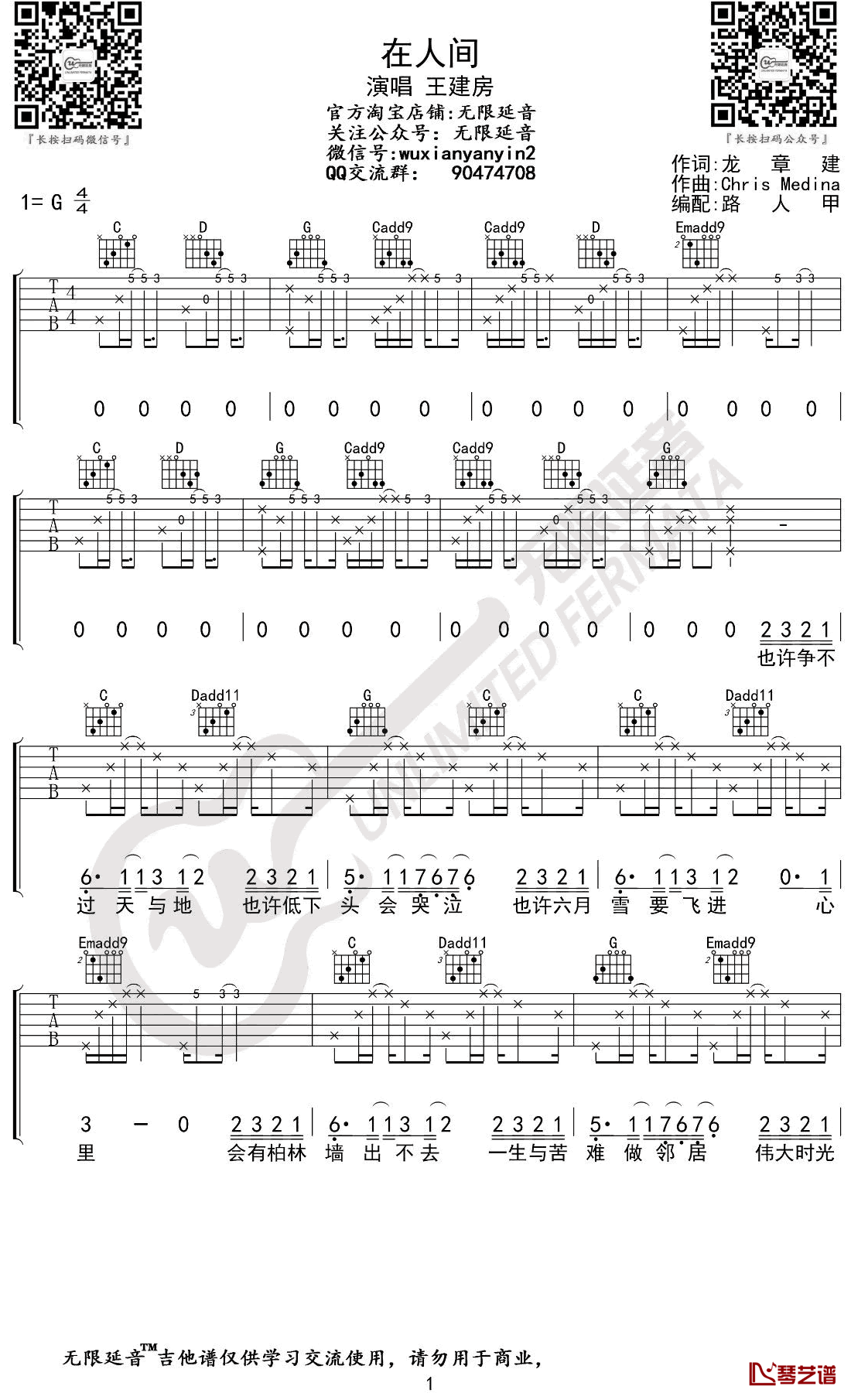 王建房《在人间》吉他谱G调弹唱谱...