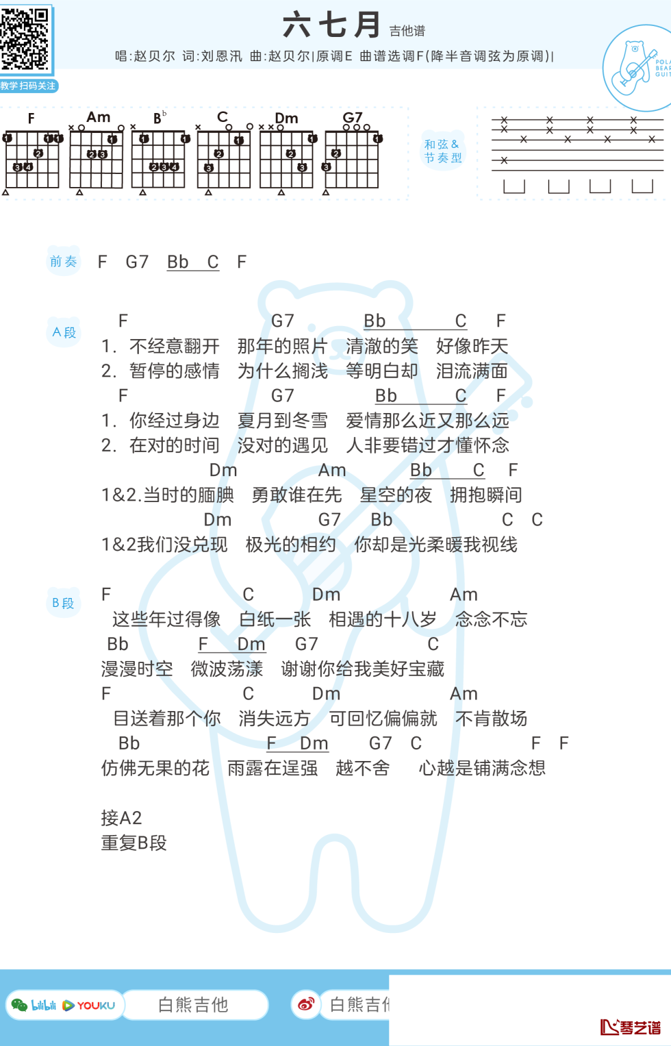 《六七月》吉他谱赵贝尔F调...