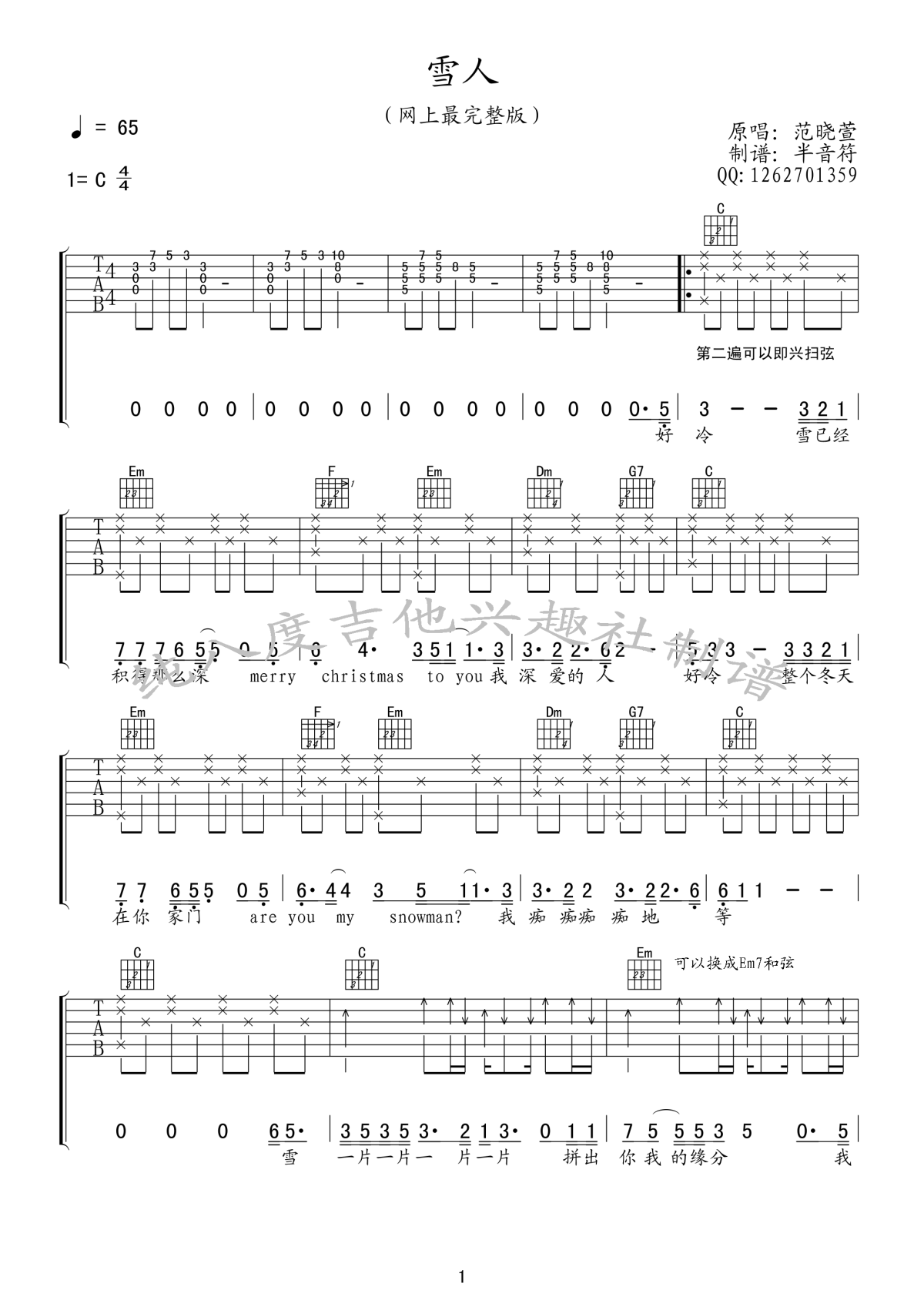 吉他范晓萱《雪人》吉他谱C调
