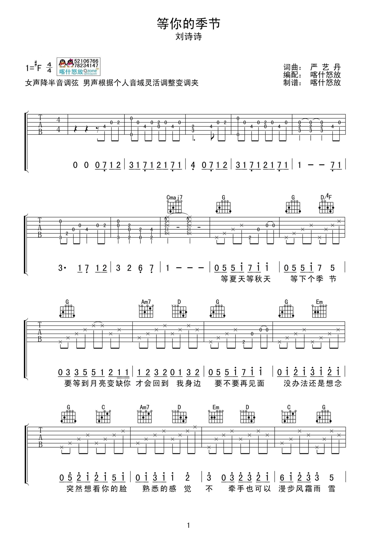 刘诗诗《等你的季节》吉他谱F调...