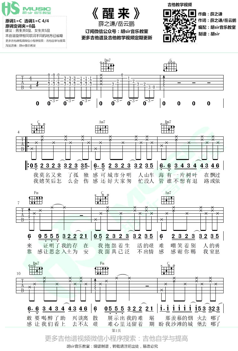 薛之谦/岳云鹏《醒来》吉他谱-C调弹唱六线谱...