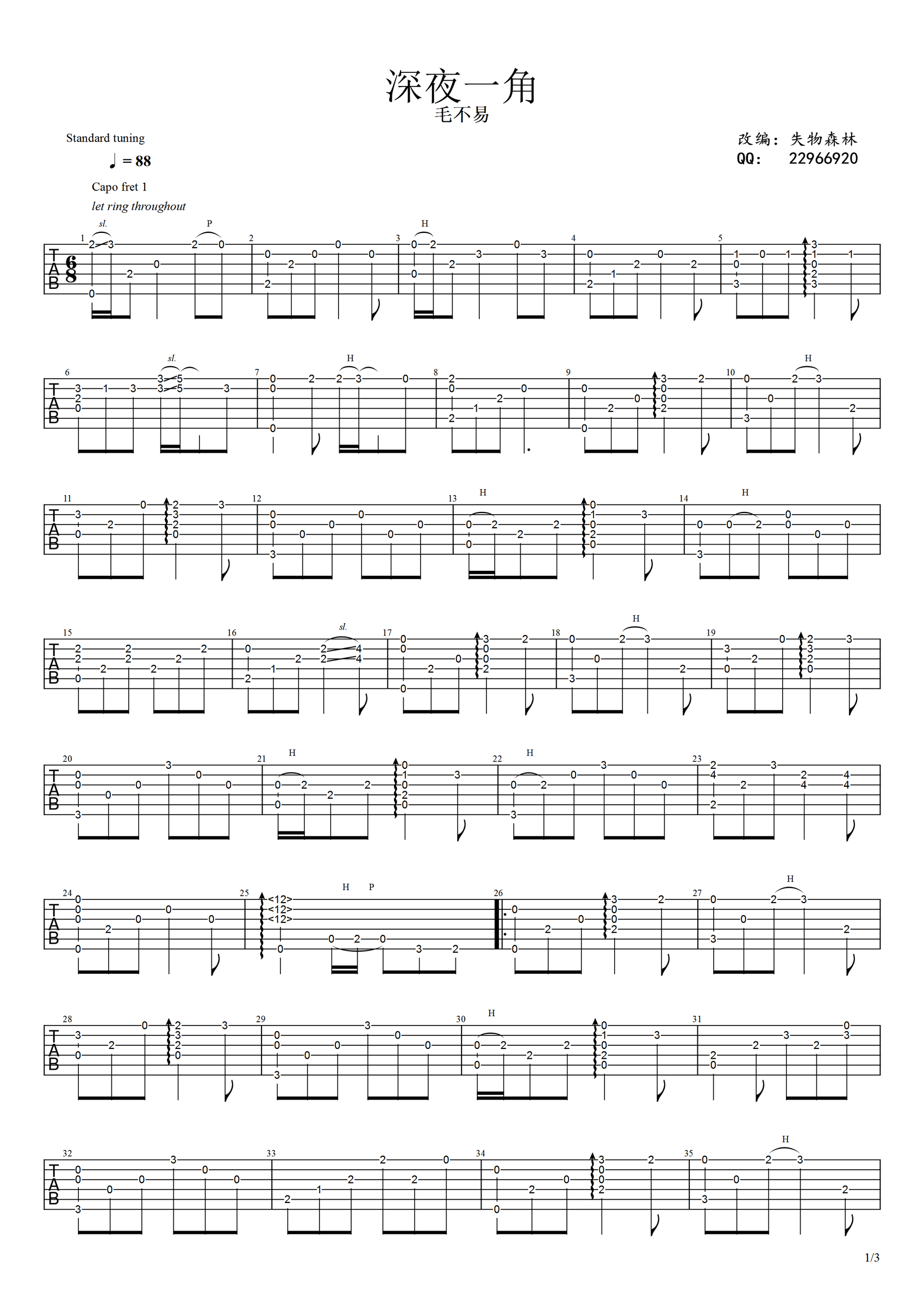 吉他毛不易《深夜一角》指弹吉他谱_独奏六线谱