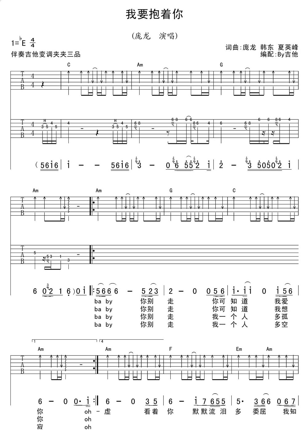 庞龙《我要抱着你》吉他谱_C调弹唱六线谱...