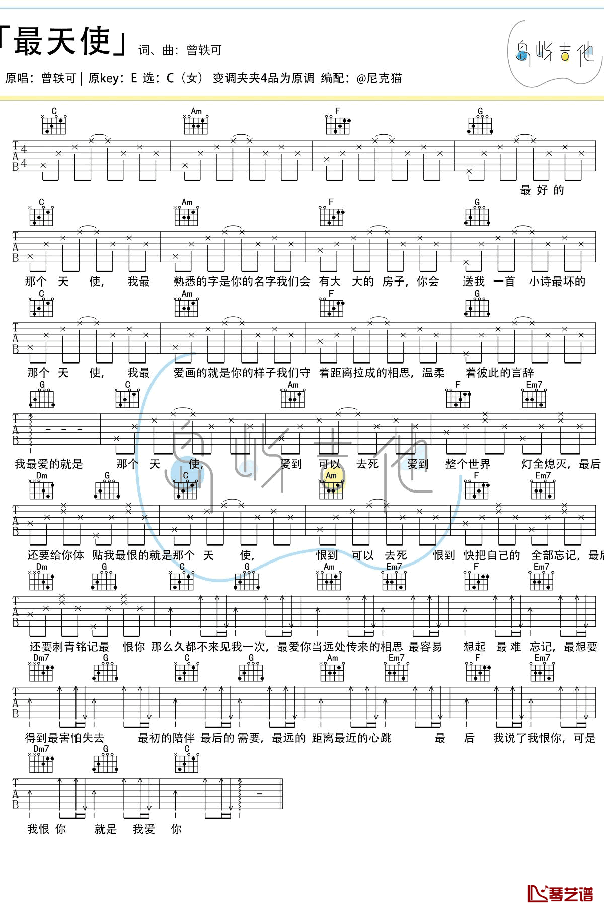 曾轶可《最天使》吉他谱C调弹唱谱...