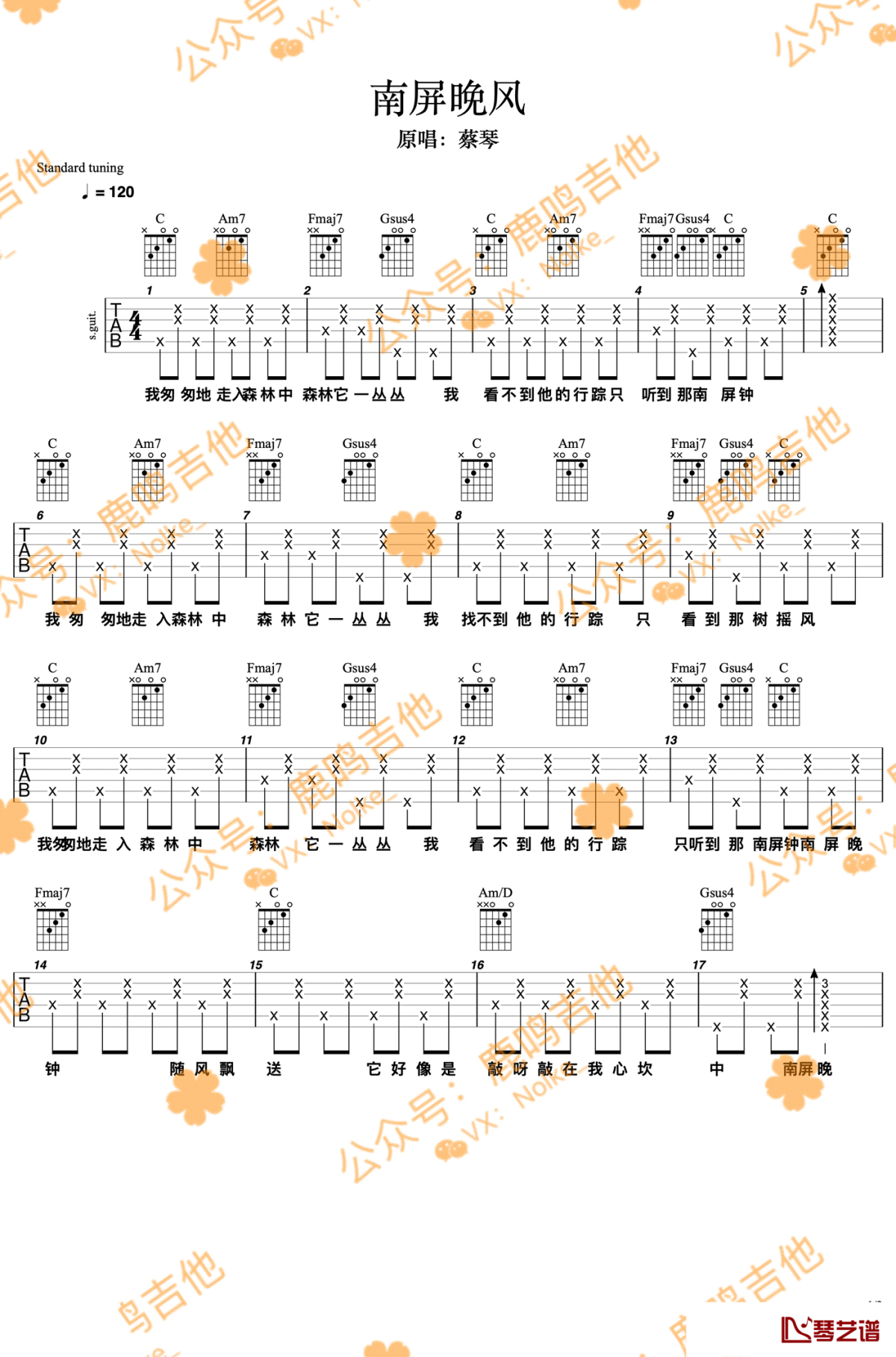 吉他蔡琴《南屏晚钟》C调弹唱六线谱