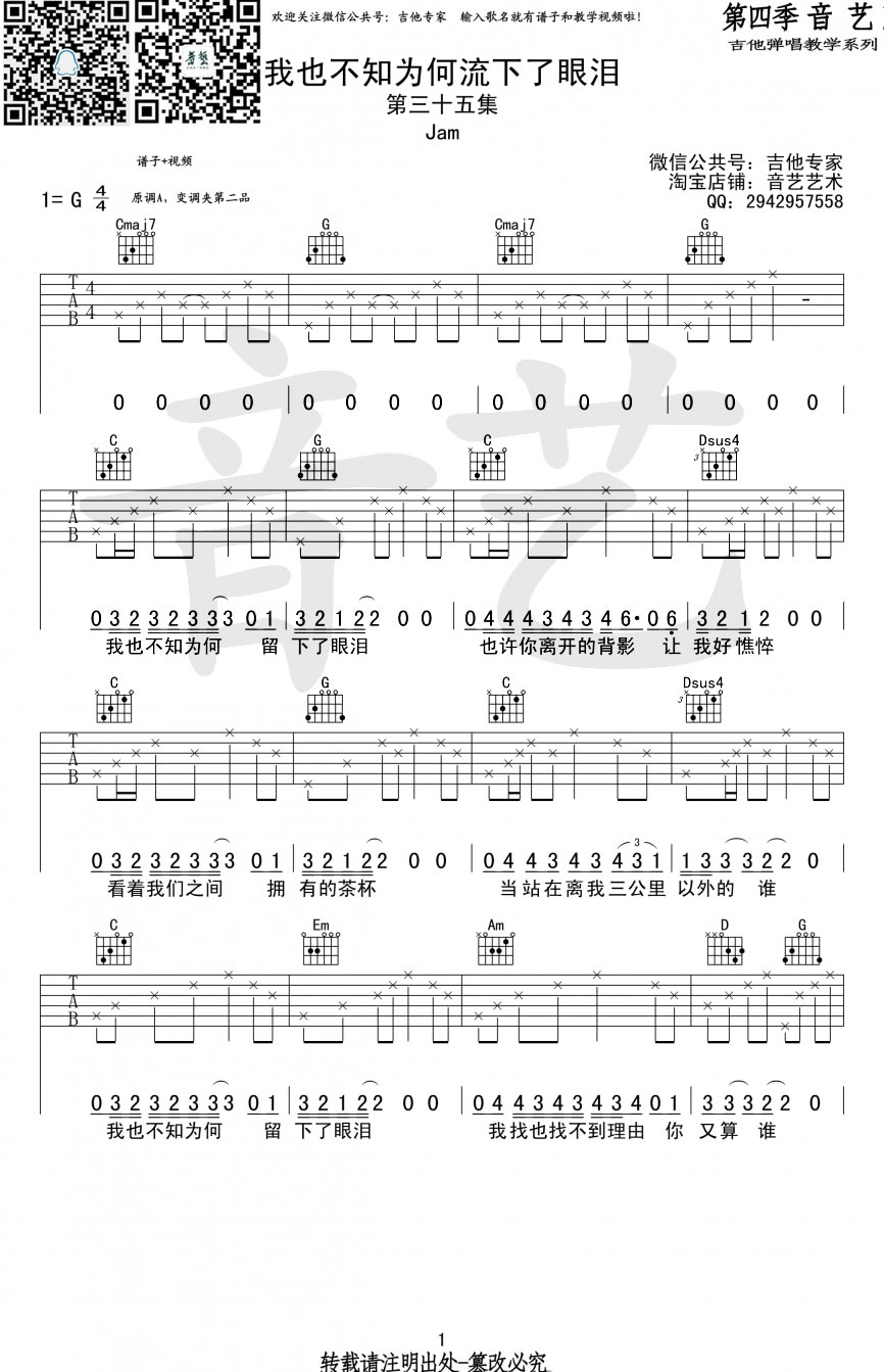 吉他Jam《我也不知为何流下了眼泪》吉他谱_G调弹唱六线谱