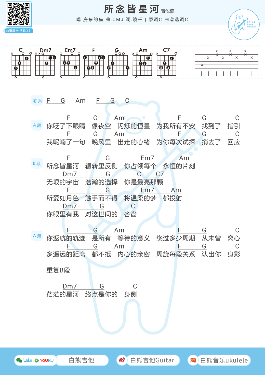 吉他房东的猫《所念皆星河》吉他谱