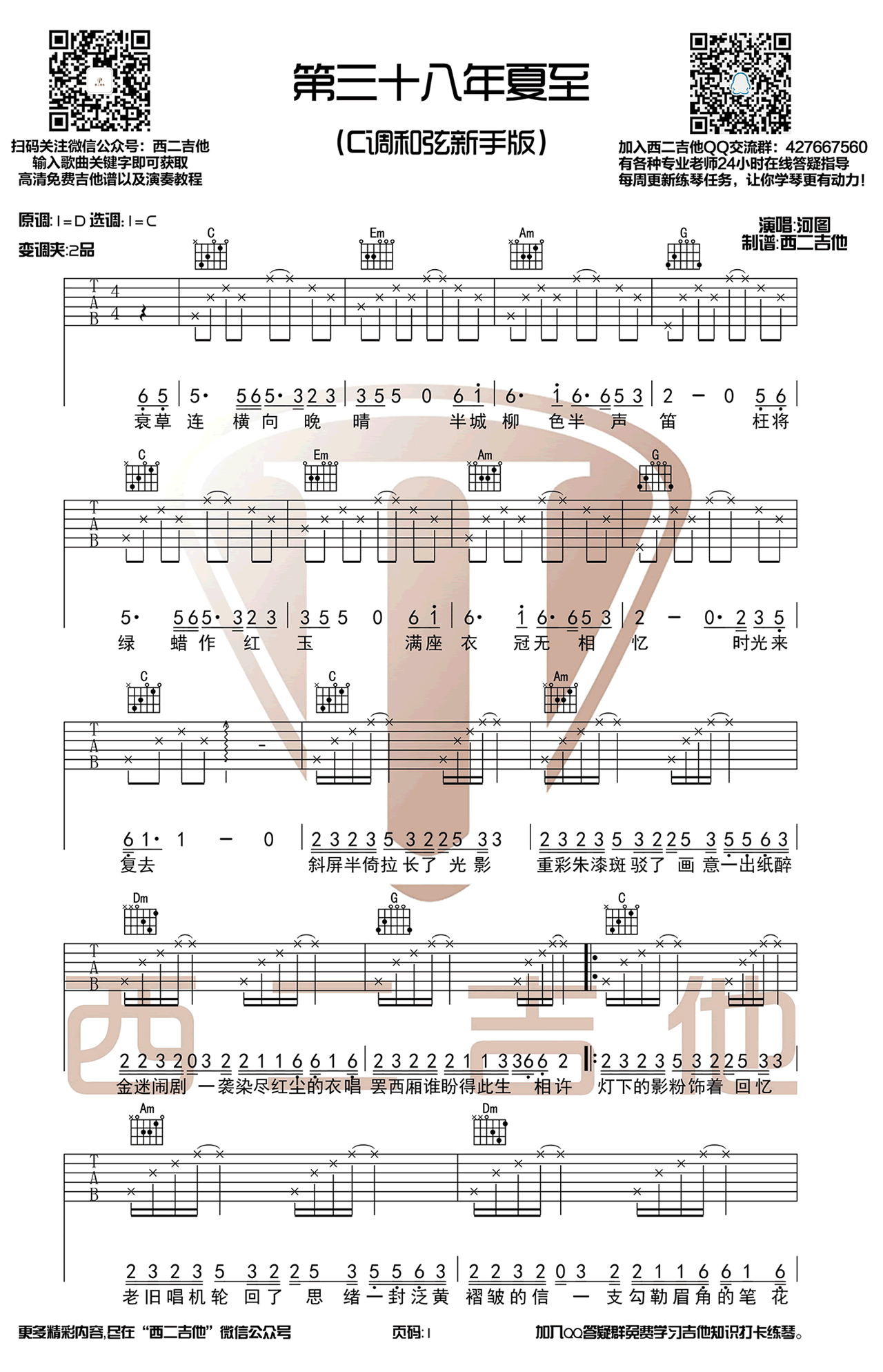 吉他河图《第三十八年夏至》吉他谱_C调简单版弹唱谱