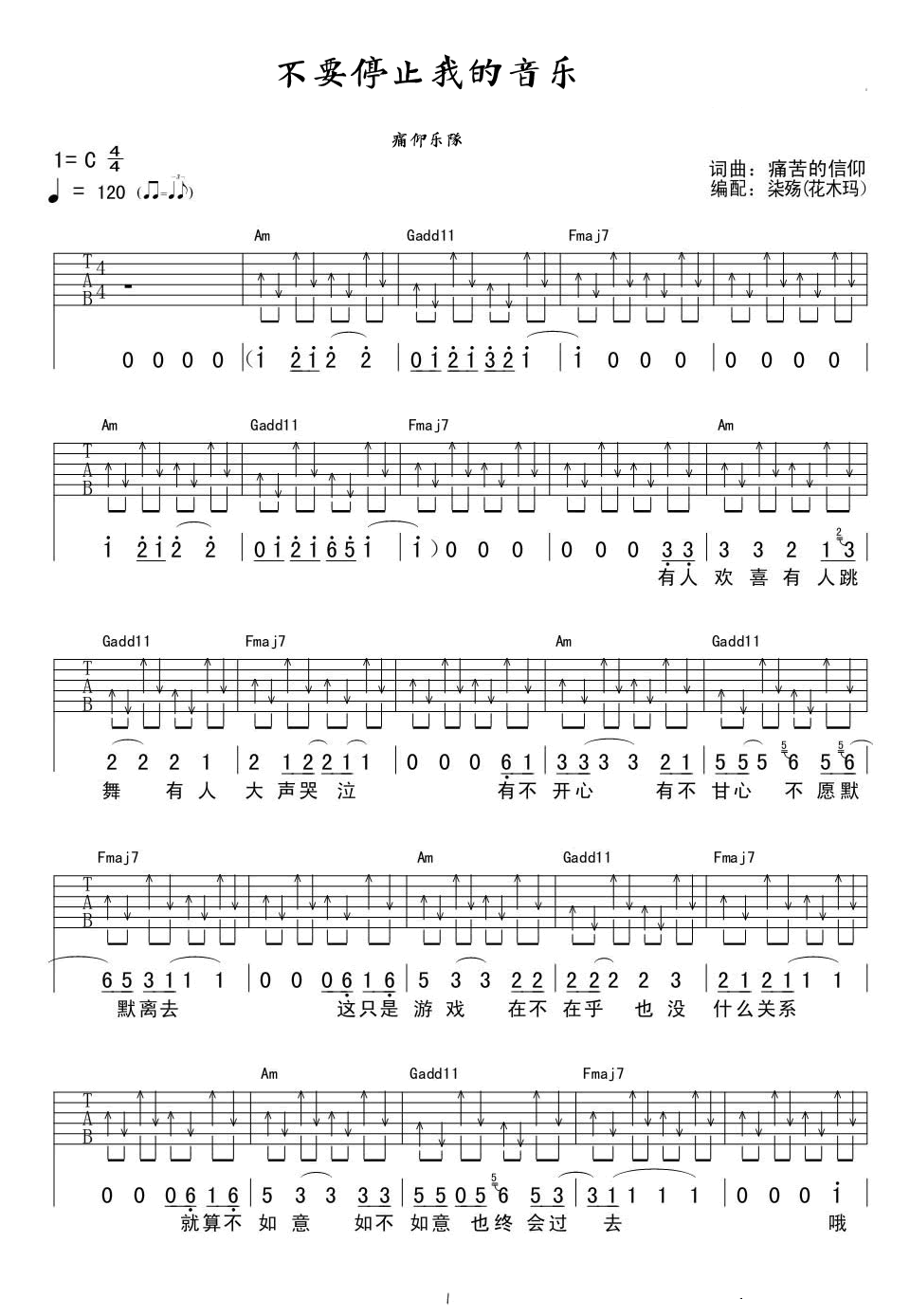 痛仰乐队《不要停止我的音乐》吉他谱_C调弹唱六线谱...