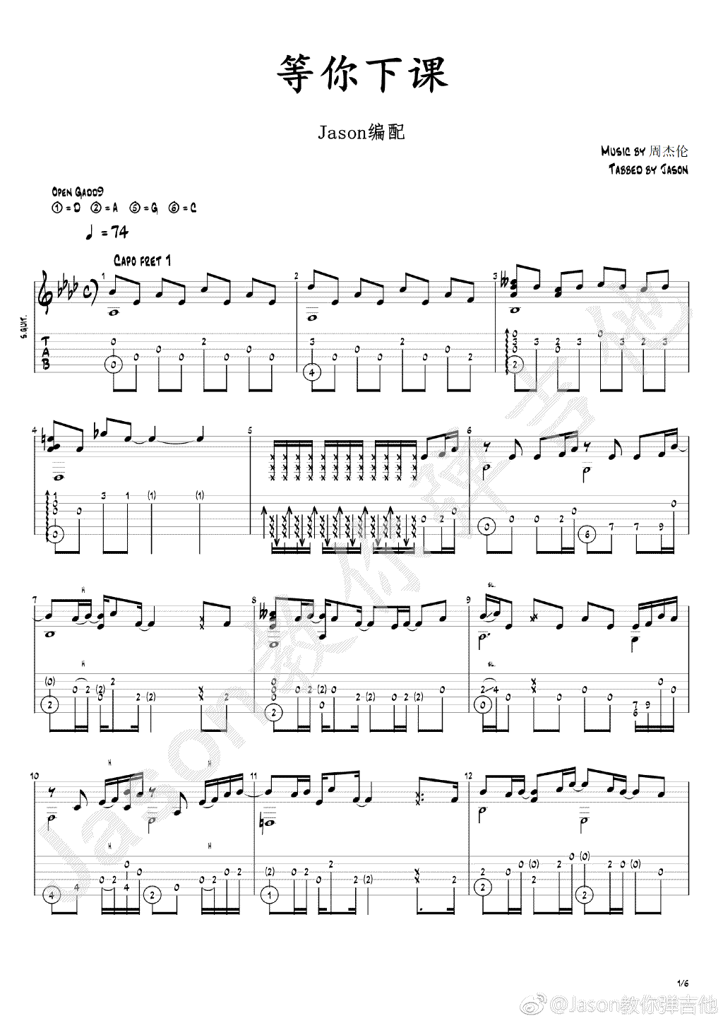 吉他周杰伦《等你下课》指弹吉他谱__独奏六线谱