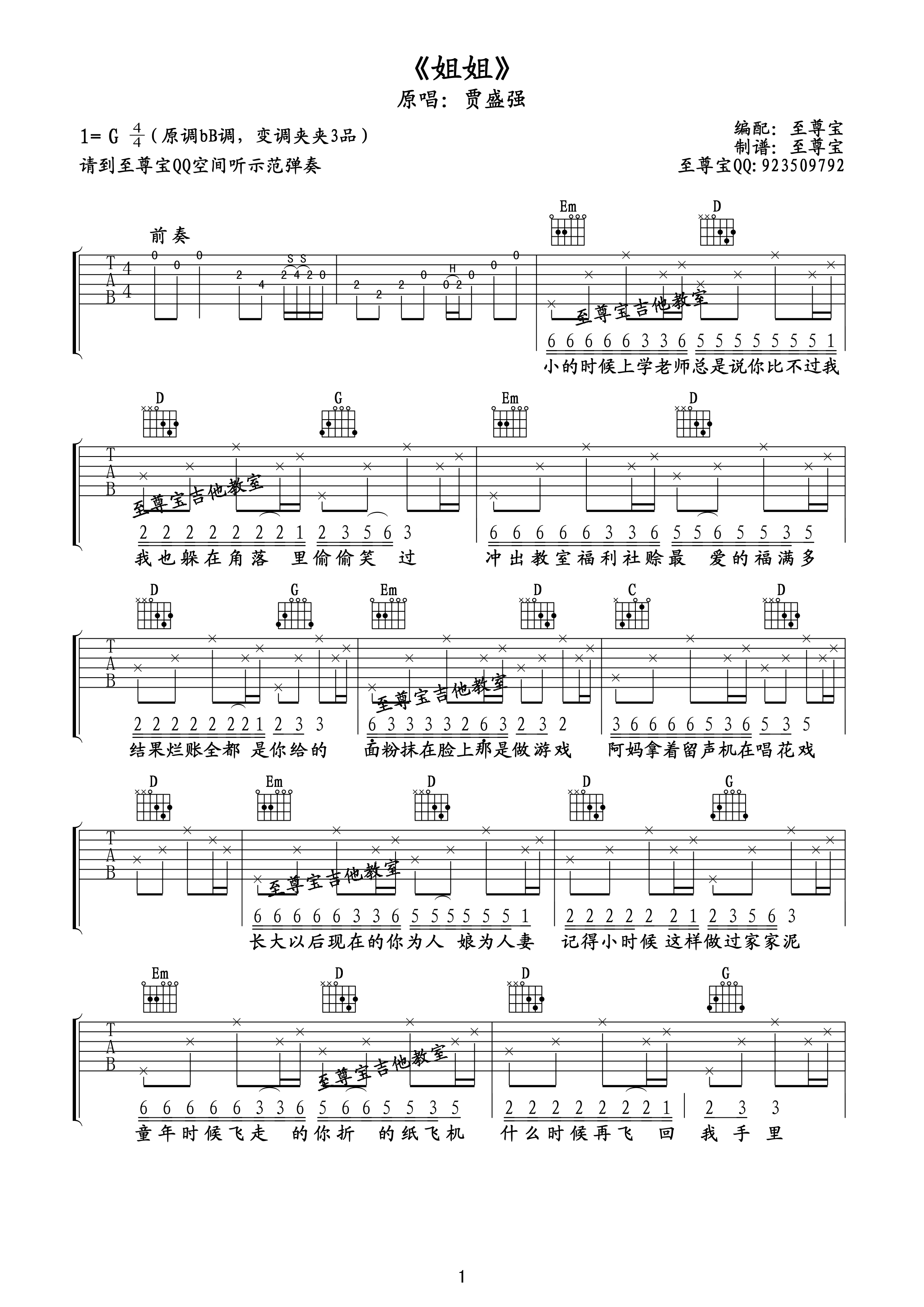 贾盛强《姐姐》吉他谱-G调原版弹唱六线谱...