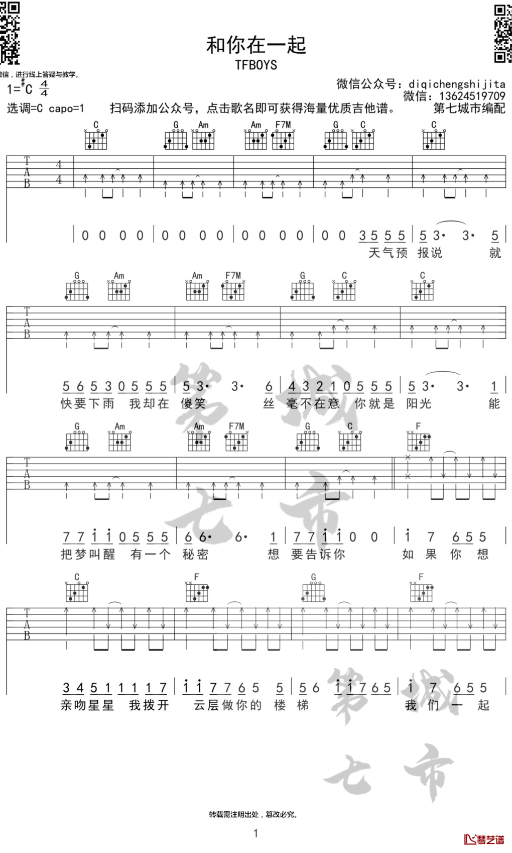 TFBOYS《和你在一起》吉他谱-C调弹唱谱...