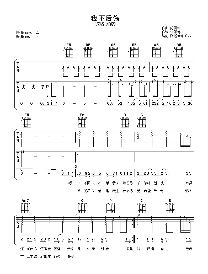 吉他郑源《我不后悔》吉他谱_G调原版弹唱六线谱