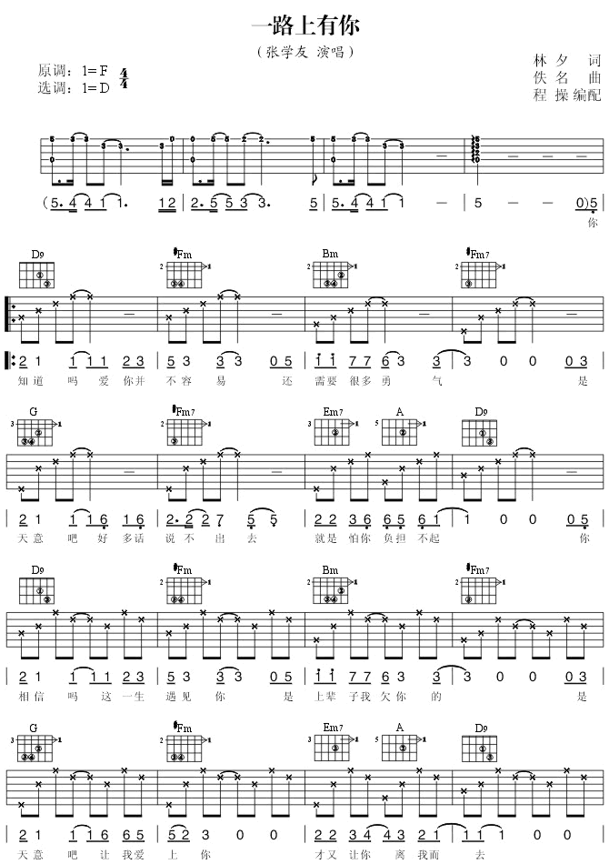 张学友《一路上有你》吉他谱__D调弹唱六线谱...