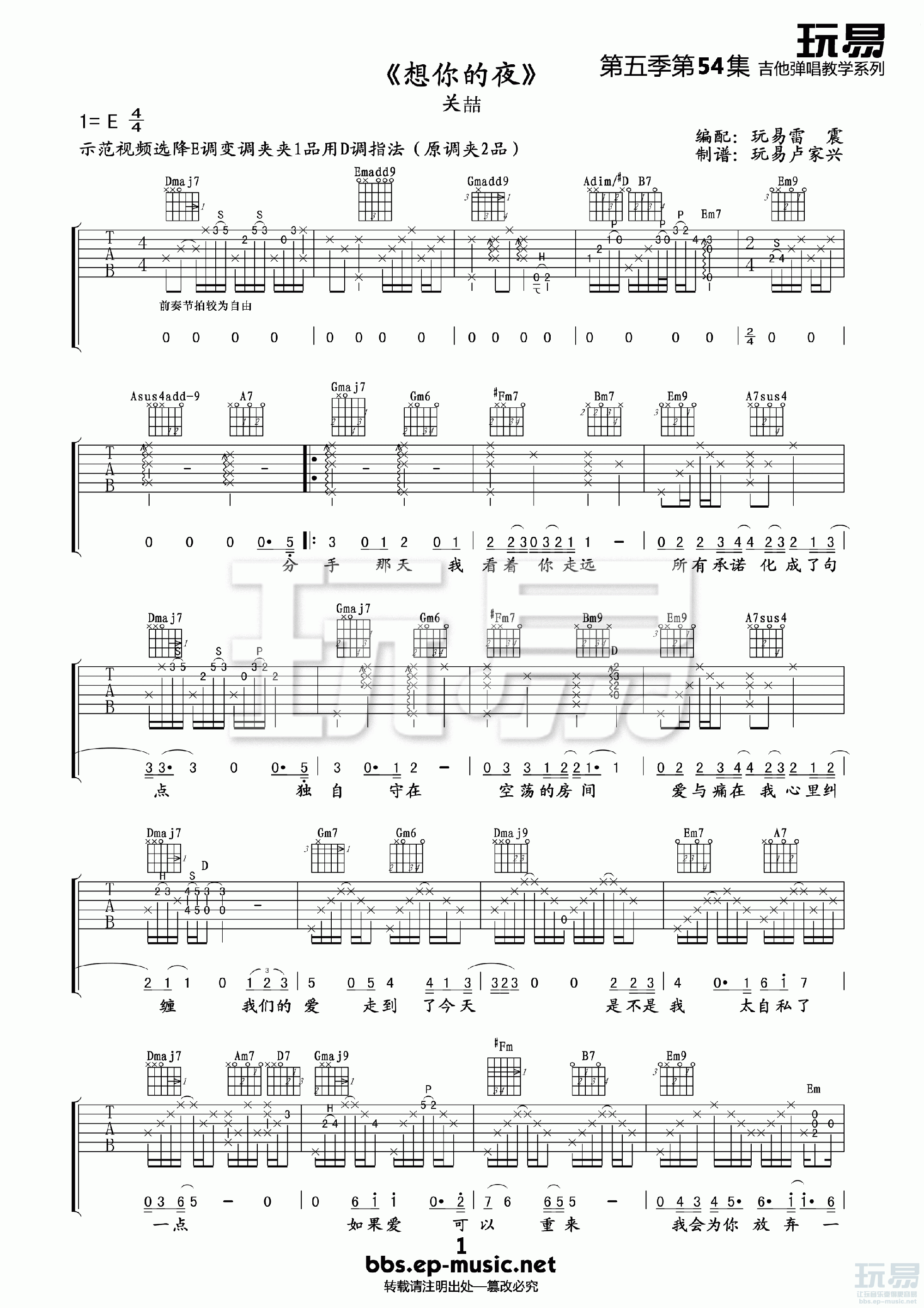 吉他关喆《想你的夜》吉他谱__D调原版弹唱六线谱
