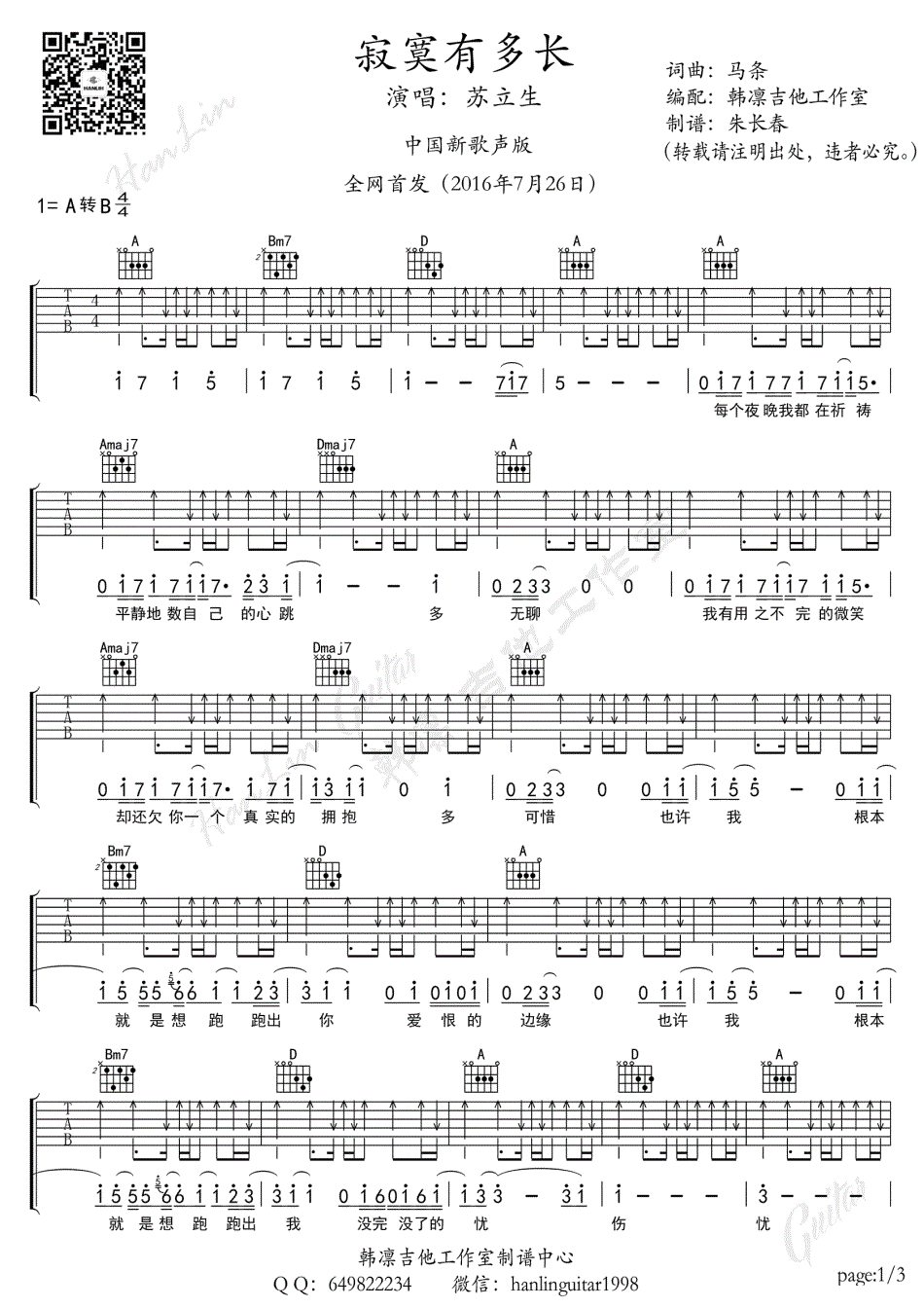 马条/苏立生《寂寞有多长》吉他谱_A调弹唱六线谱...