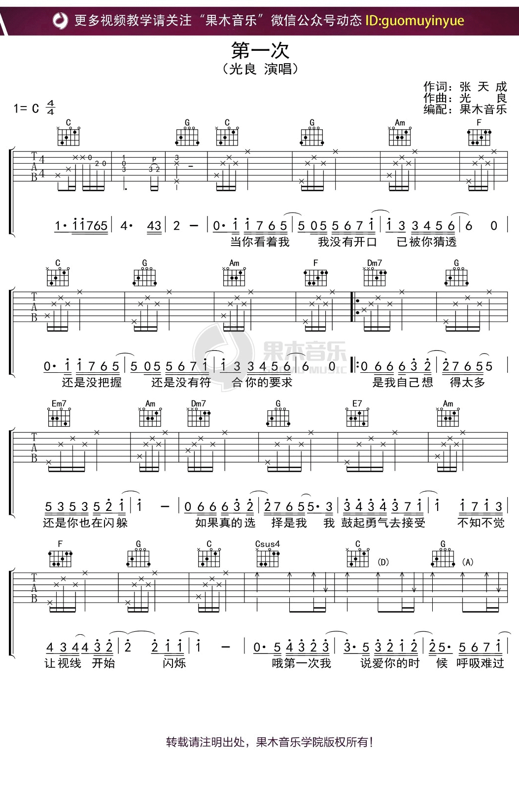吉他光良《第一次》吉他谱-C调原版弹唱六线谱