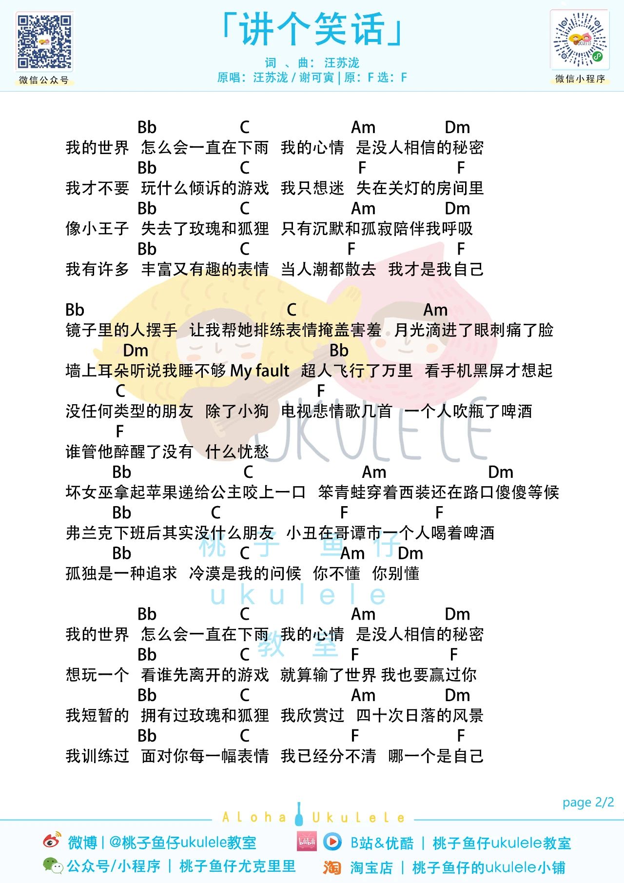 汪苏泷《讲个笑话》吉他谱F调和弦谱...