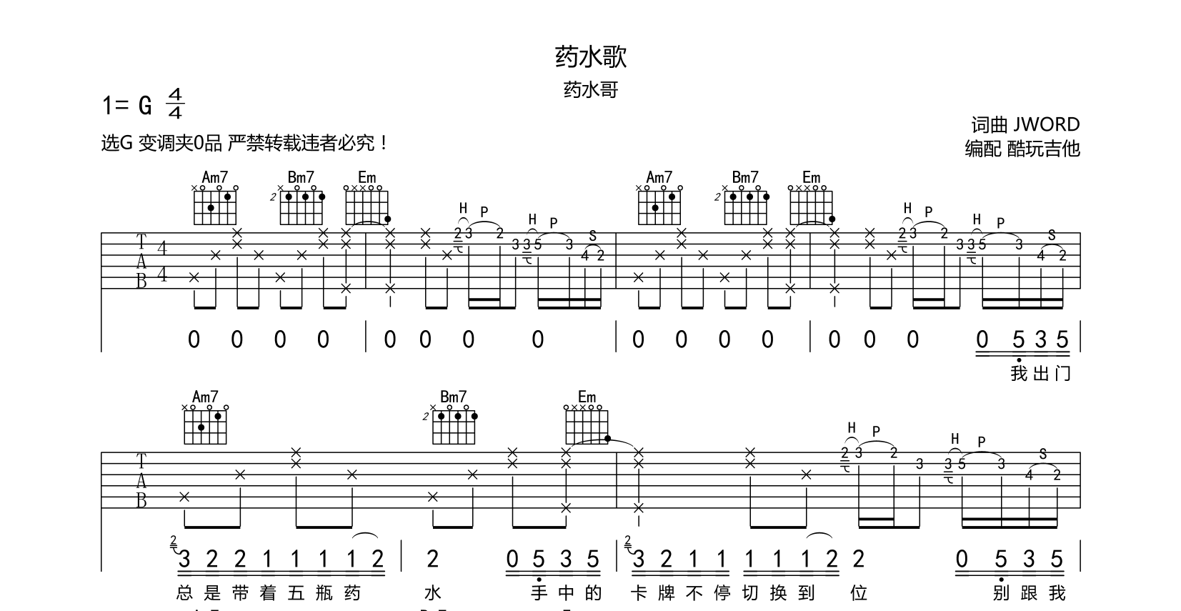 药水哥《药水歌》吉他谱-G调吉他弹唱谱六线谱编配中采用原曲效果并去除了大横按技巧嫌贵简单弹唱部分初学者可使用最后一页推荐的节奏音频只是录制了前奏以作试听示范...