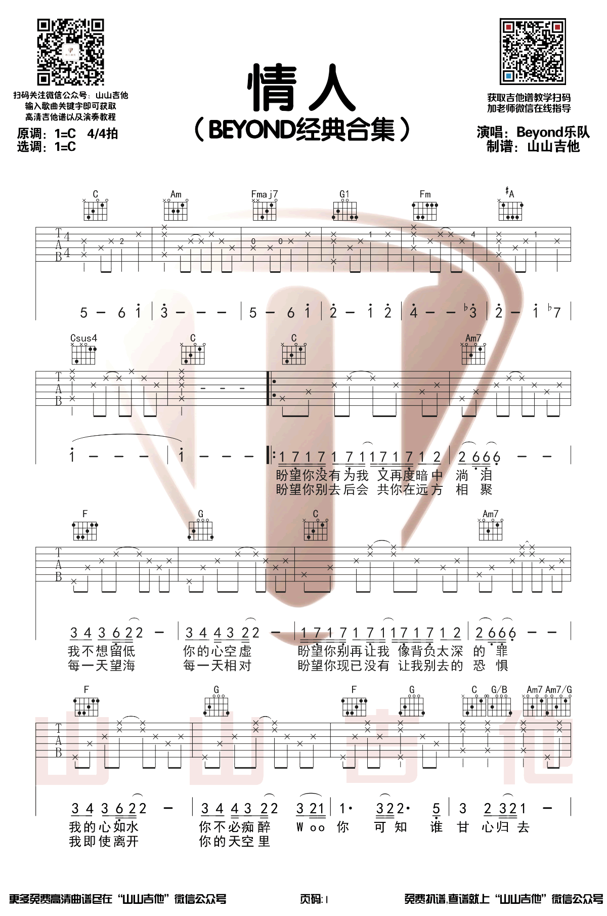 Beyond《情人》吉他谱-C调原版弹唱谱六线谱...