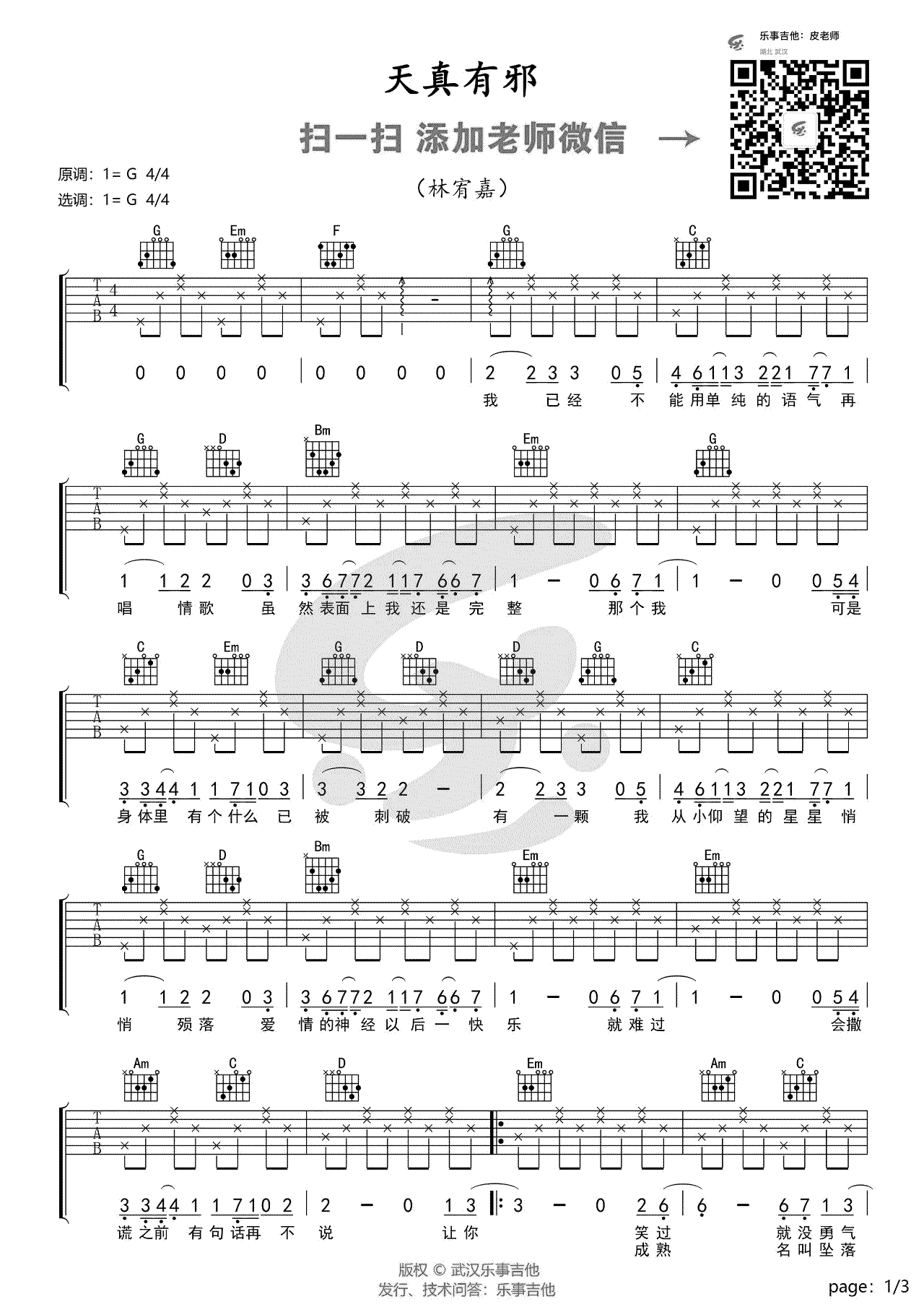 吉他林宥嘉《天真有邪》吉他谱-G调简单版弹唱谱六线谱
