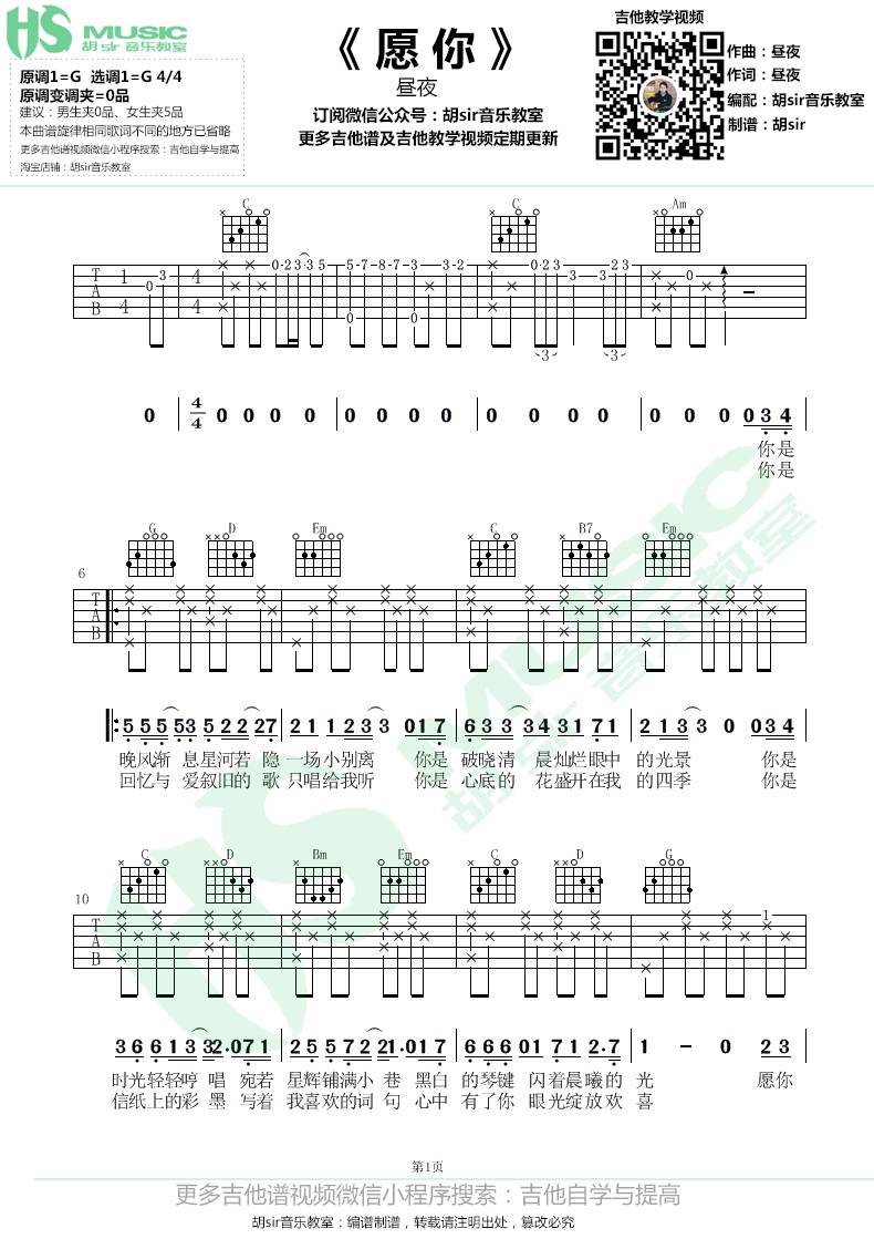昼夜《愿你》吉他谱--G调弹唱谱六线谱...