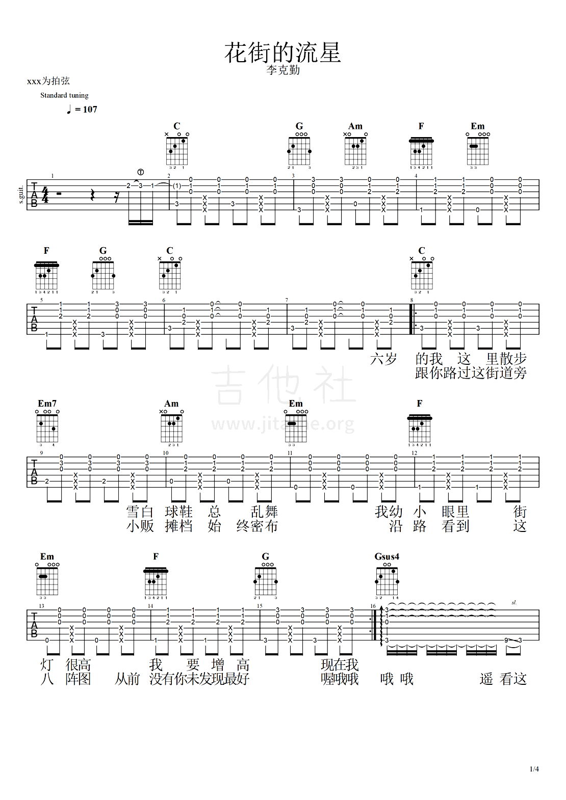 吉他李克勤《花街的流星》吉他谱-C调弹唱谱六线谱