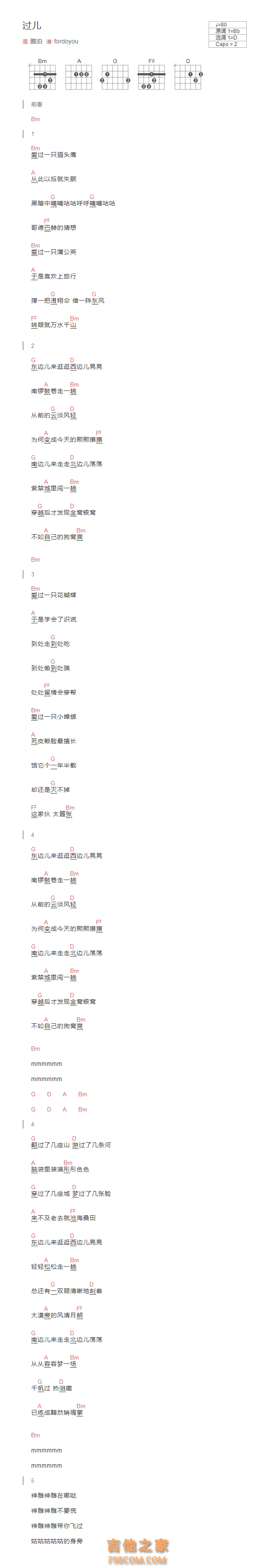 吉他鹏泊《过儿》吉他谱-D调版弹唱谱