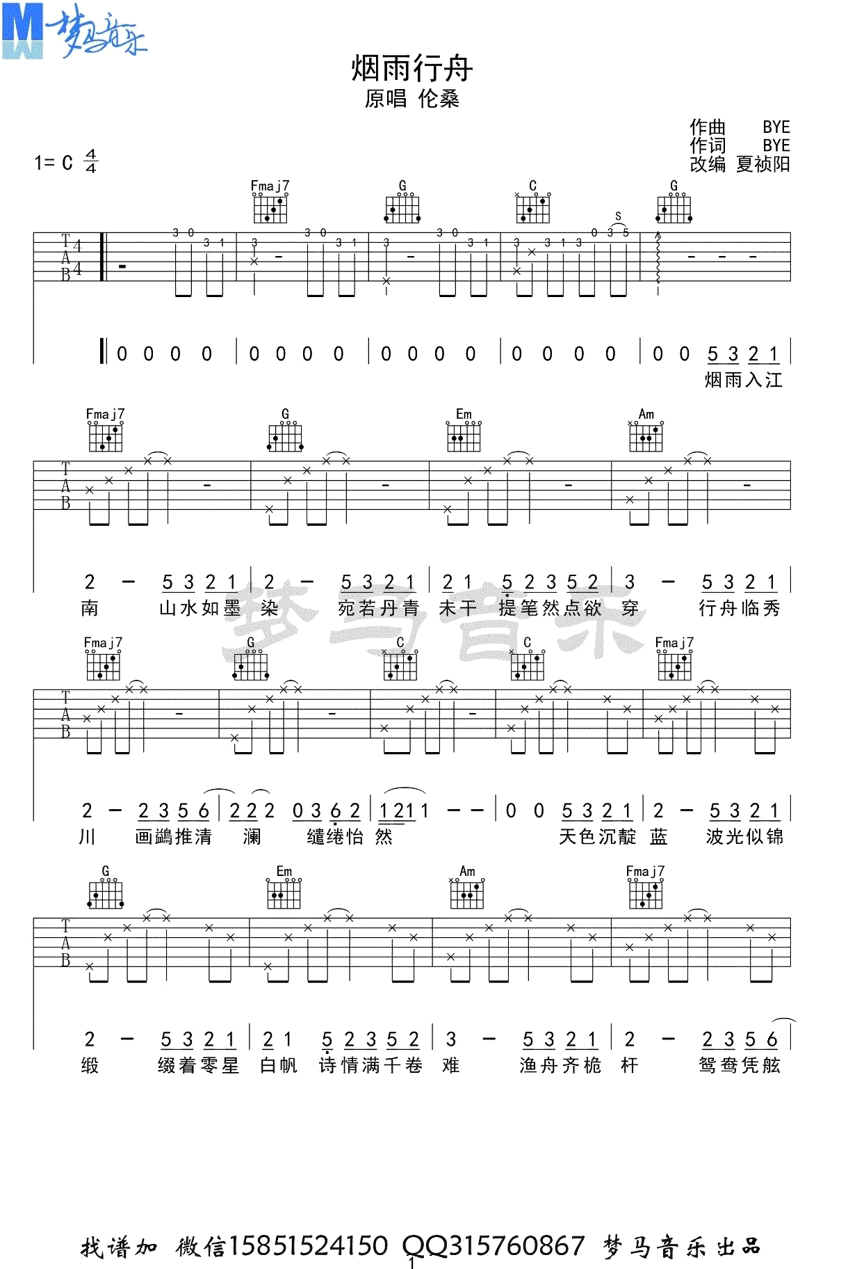 伦桑《烟雨行舟》吉他谱-C调弹唱谱六线谱...