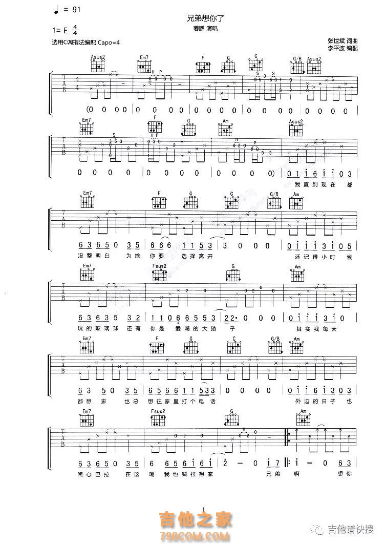 吉他姜鹏 《兄弟想你了》 吉他谱-C调弹唱谱
