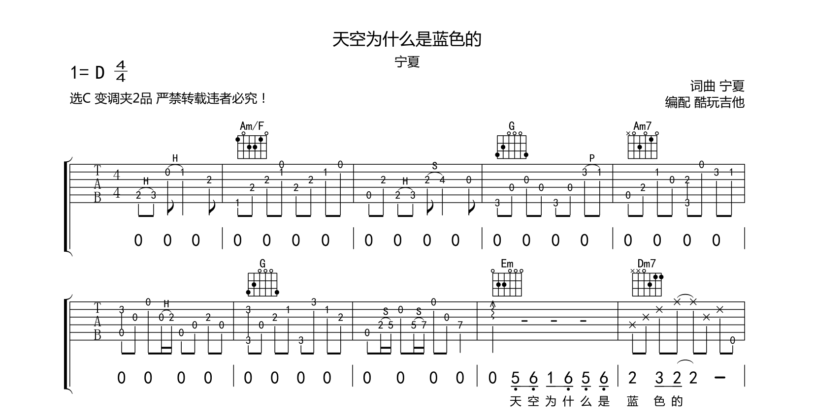 吉他 宁夏《天空为什么是蓝色的》吉他谱-C调弹唱谱琴友定制