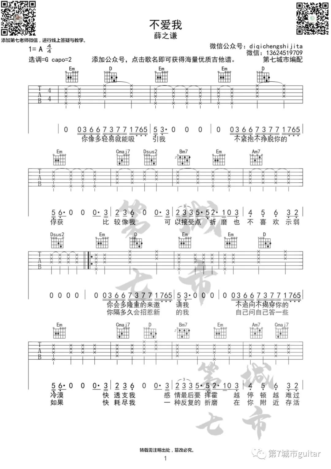 薛之谦《不爱我》吉他谱-G调弹唱谱六线谱...