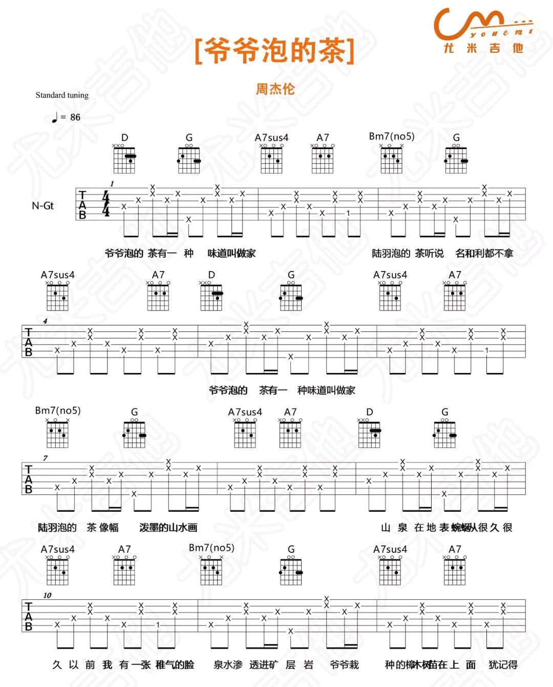 周杰伦《爷爷泡的茶》吉他谱-D调弹唱谱六线谱...