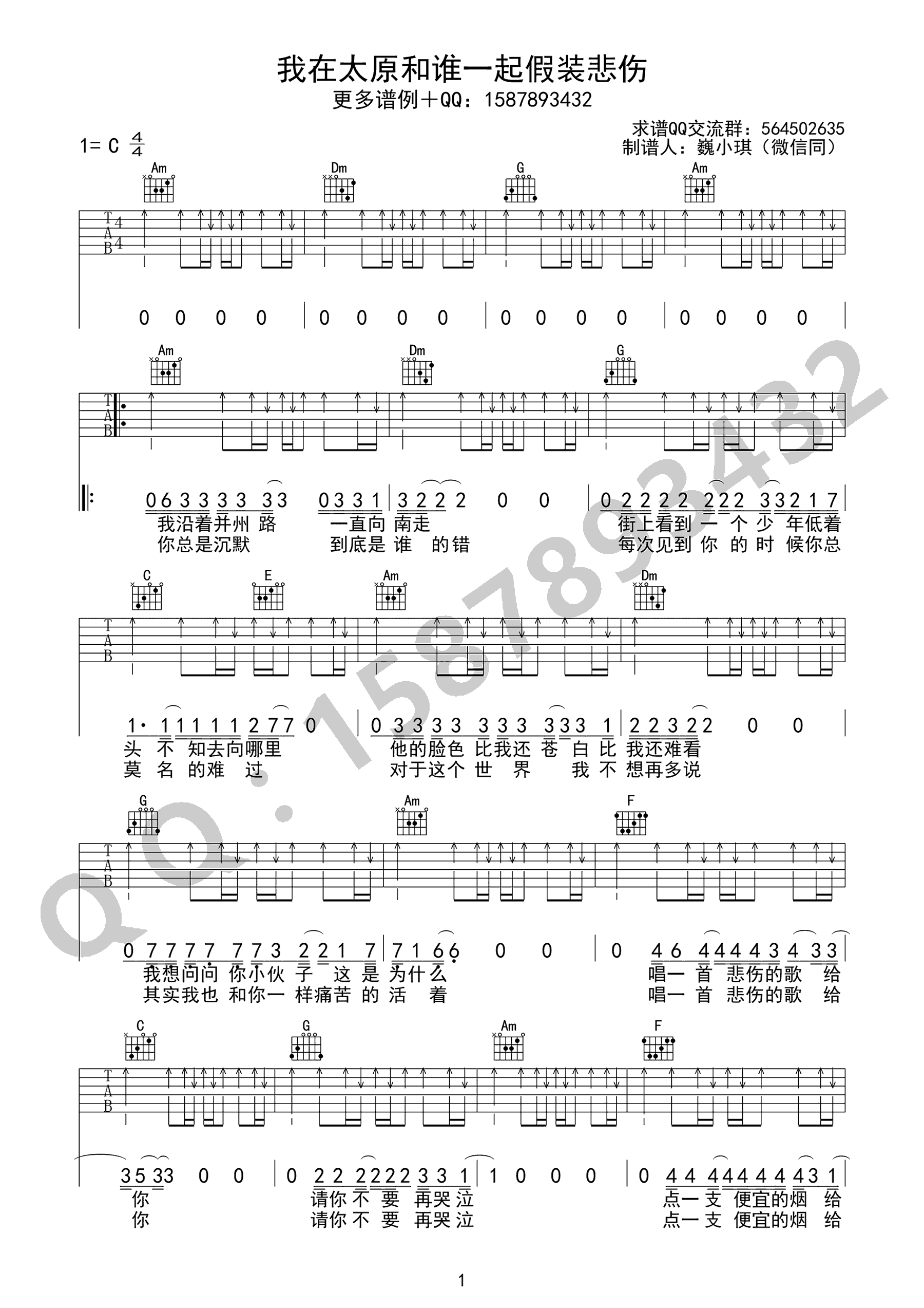 贰佰《我在太原和谁一起假装悲伤》吉他谱-C调弹唱谱六线谱...