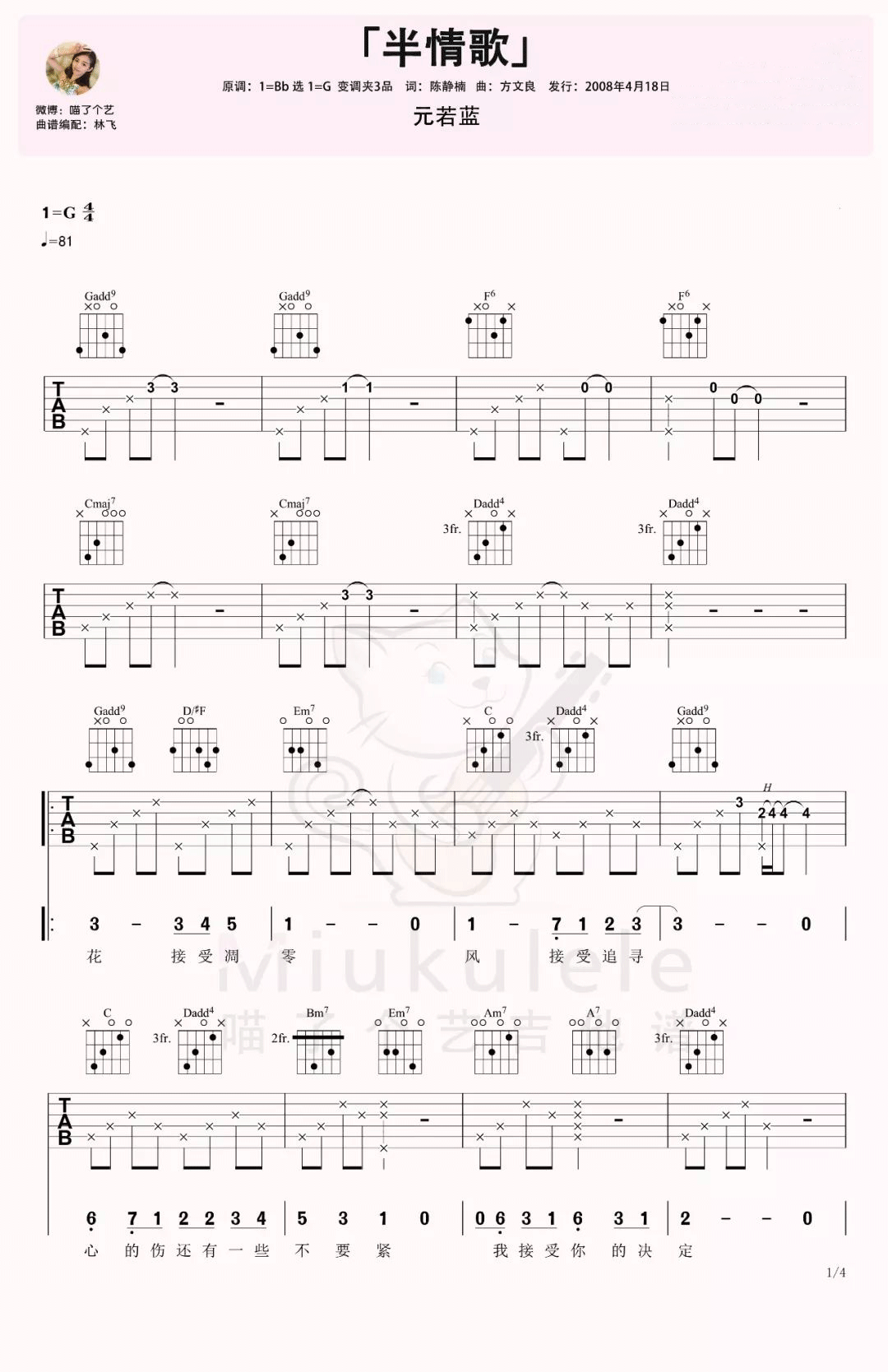 元若蓝《半情歌》吉他谱-G调原版弹唱谱六线谱...