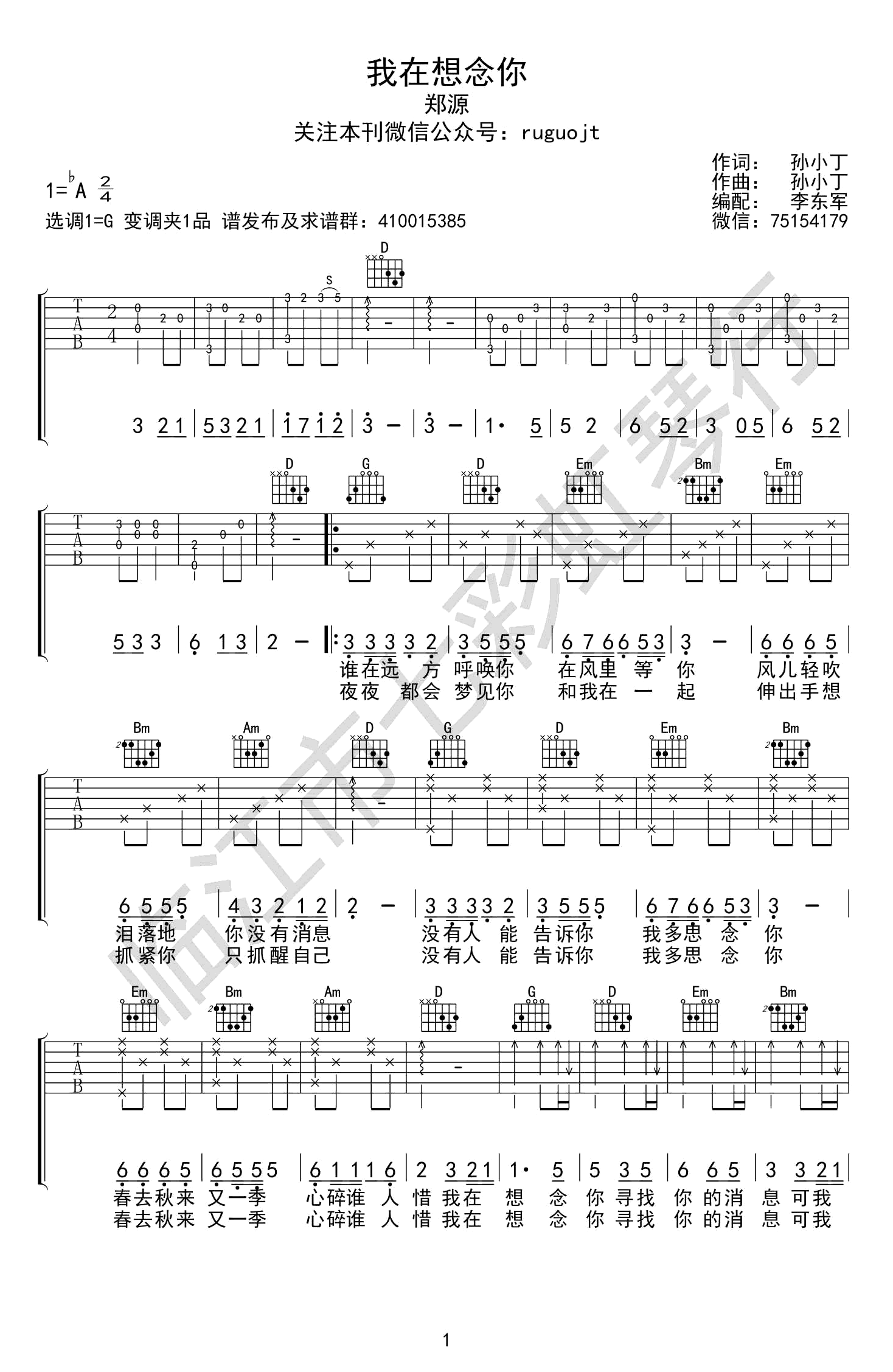 吉他郑源《我在想念你》吉他谱-G调弹唱谱六线谱
