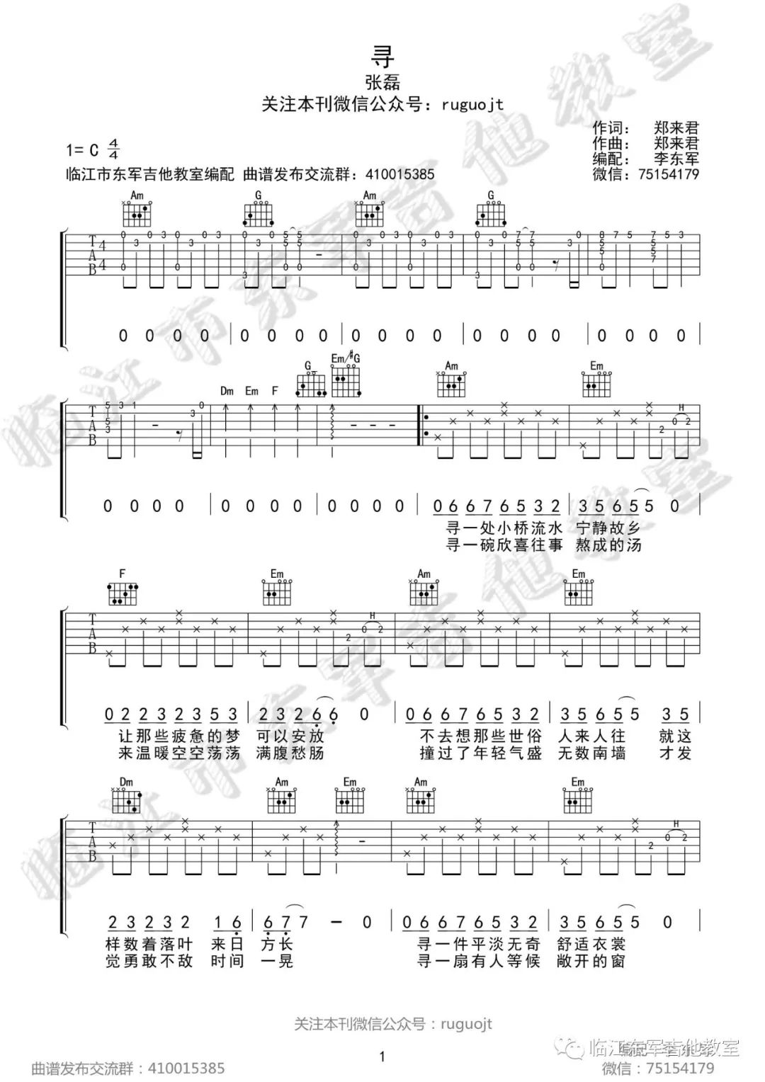 张磊《寻》吉他谱-C调原版弹唱谱六线谱...