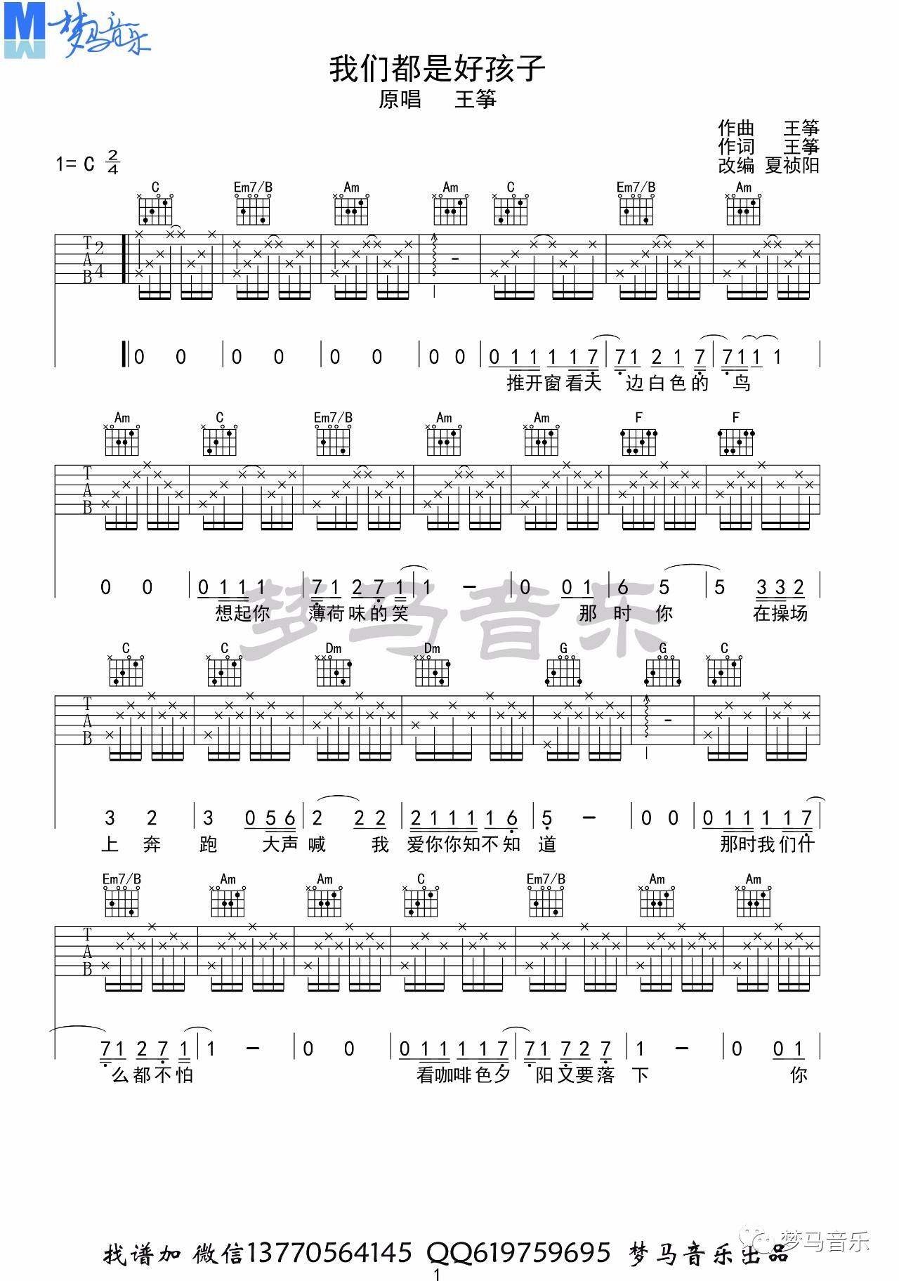 吉他王筝《我们都是好孩子》吉他谱-C调弹唱谱六线谱