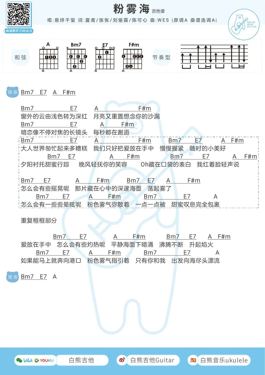 易烊千玺《粉雾海》吉他谱-A调&F调弹唱谱...