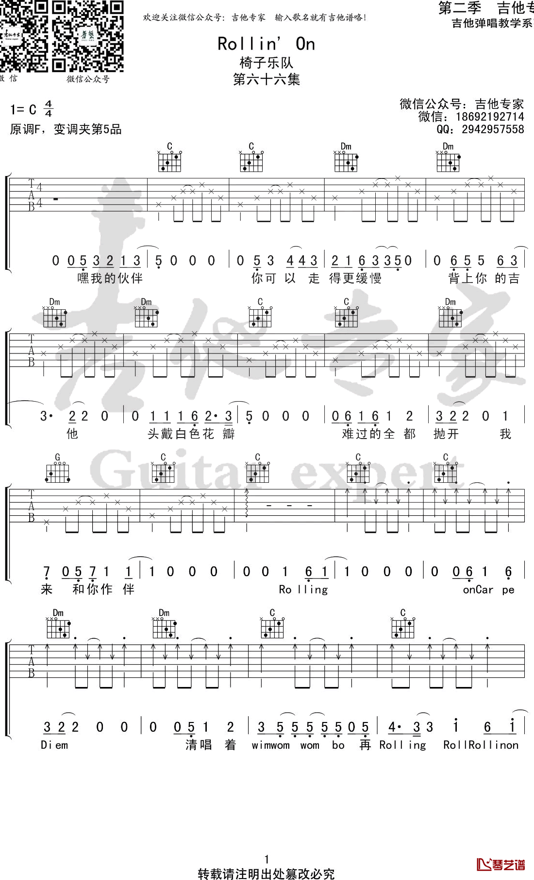 吉他椅子乐团《Rollin'On》吉他谱 - C调弹唱谱