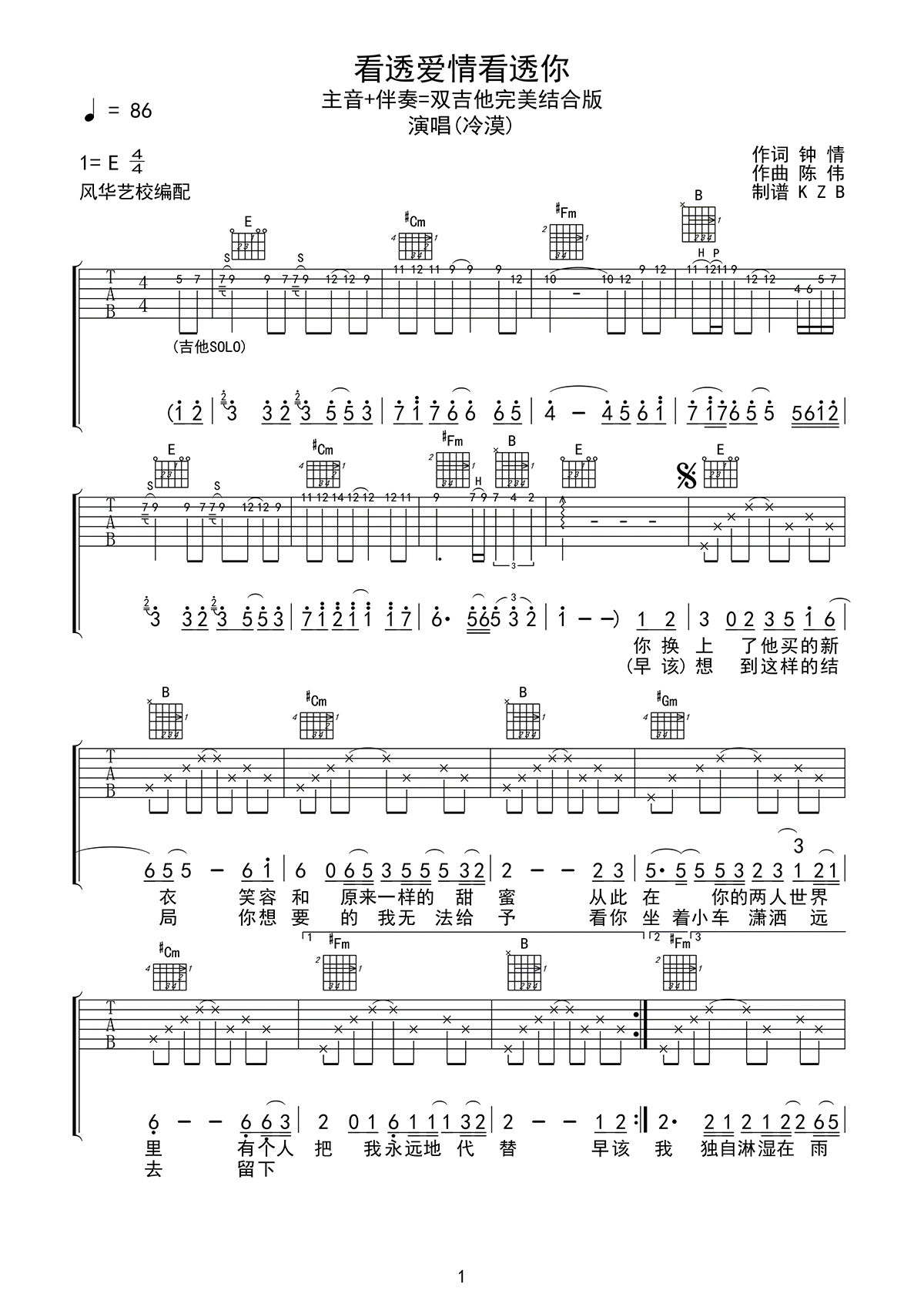 吉他冷漠《看透爱情看透你》吉他谱-E调原版弹唱谱六线谱