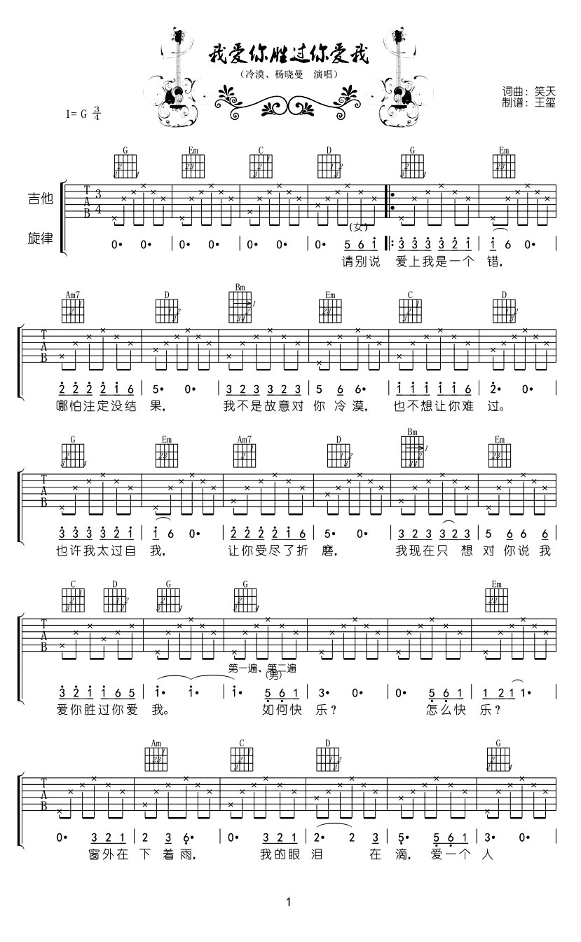 冷漠/杨晓曼《我爱你胜过你爱我》吉他谱-G调弹唱六线谱...