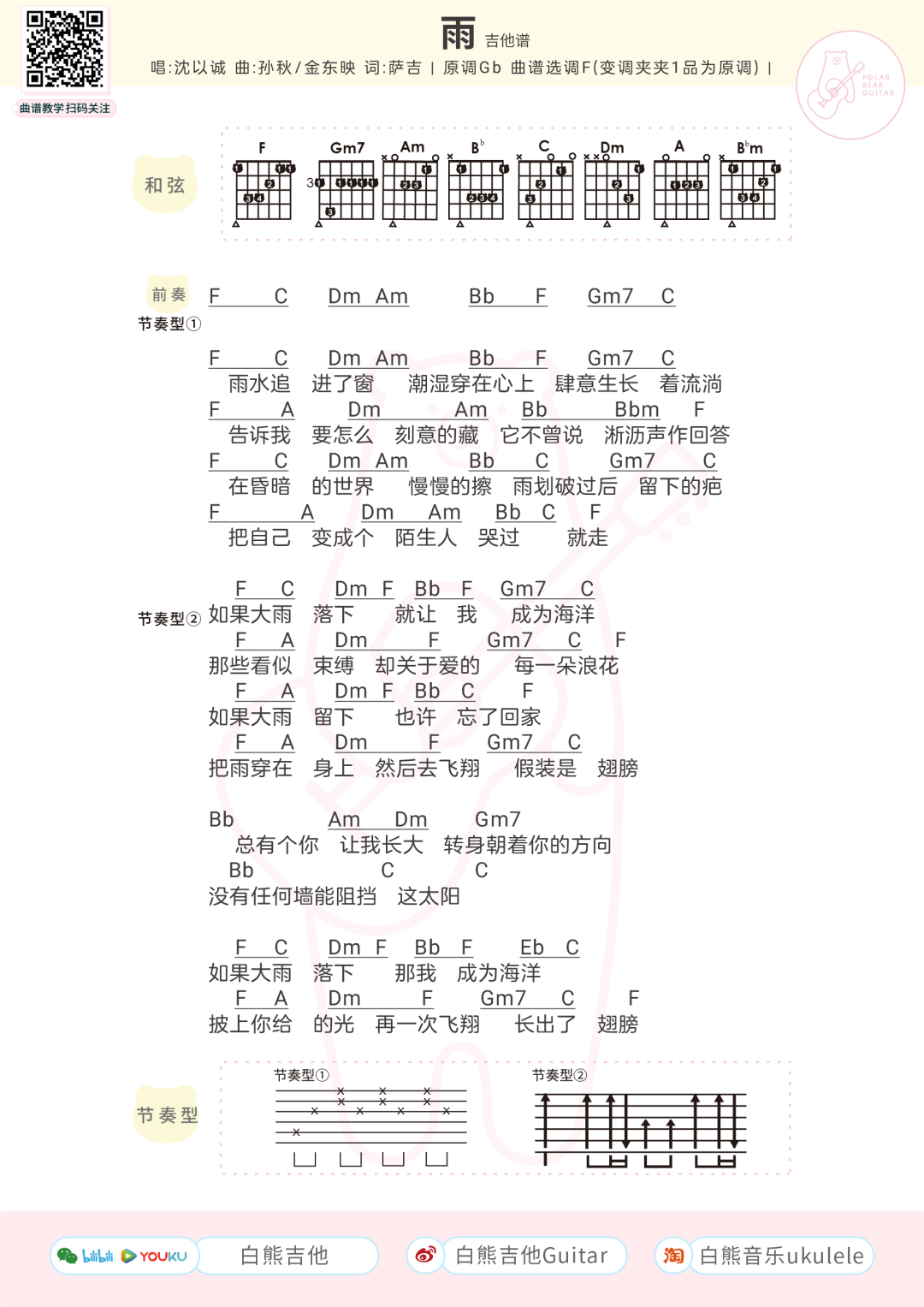 吉他沈以诚《雨》吉他谱- F调弹唱谱