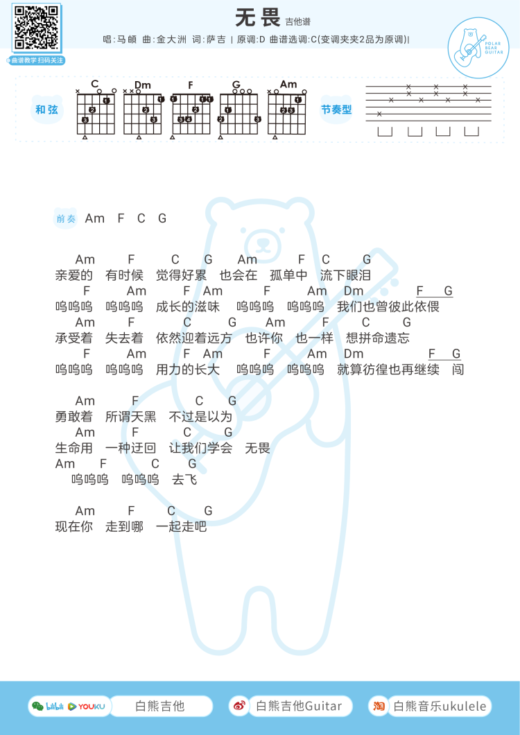 吉他马頔《无畏》吉他谱 -C调弹唱谱
