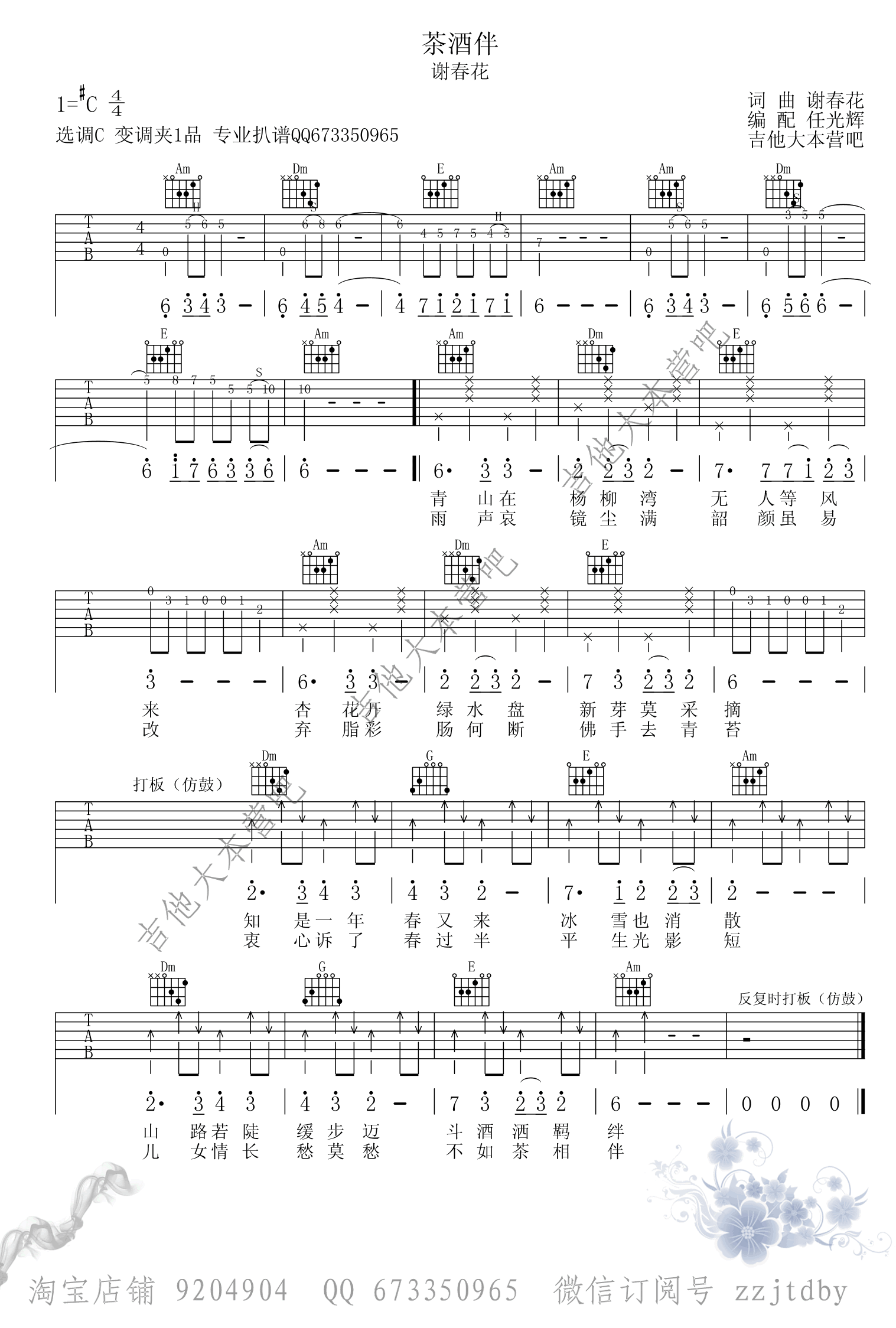 吉他茶酒伴吉他谱_谢春花_《茶酒伴》C调弹唱谱六线谱