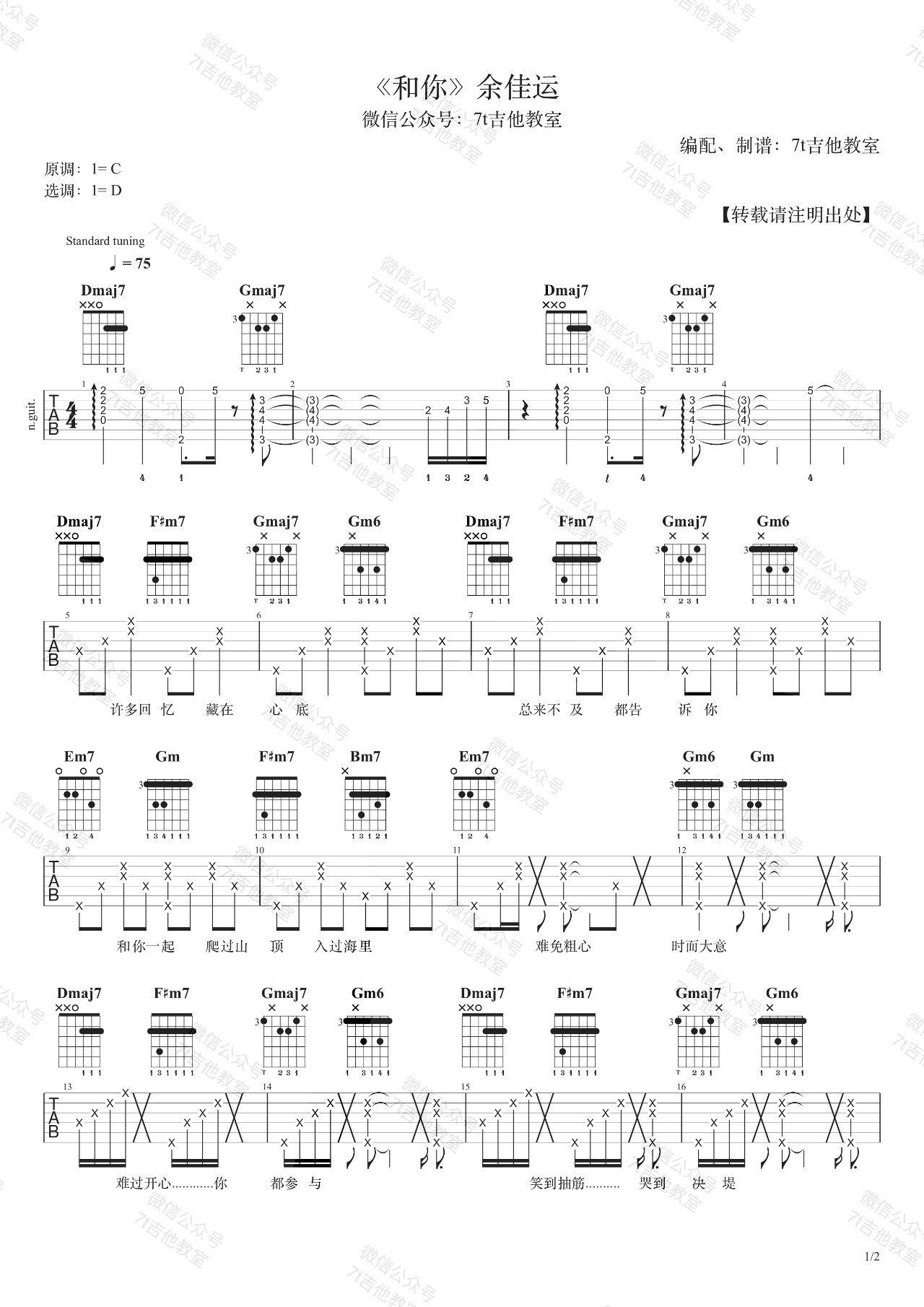 和你吉他谱_余佳运_《和你》D调弹唱谱六线谱...