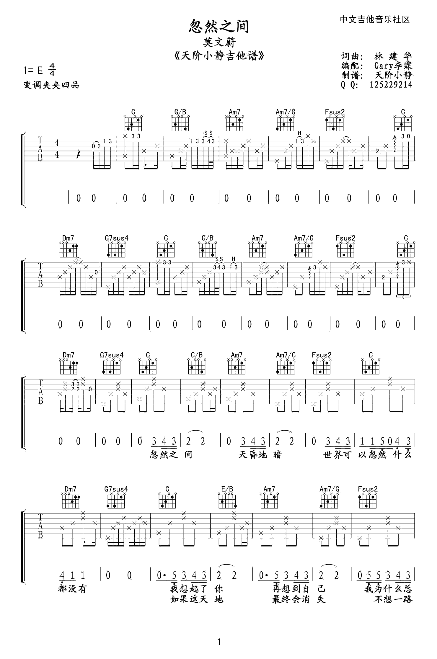 《忽然之间》吉他谱_李霖/莫文蔚_C调男生版弹唱谱六线谱...