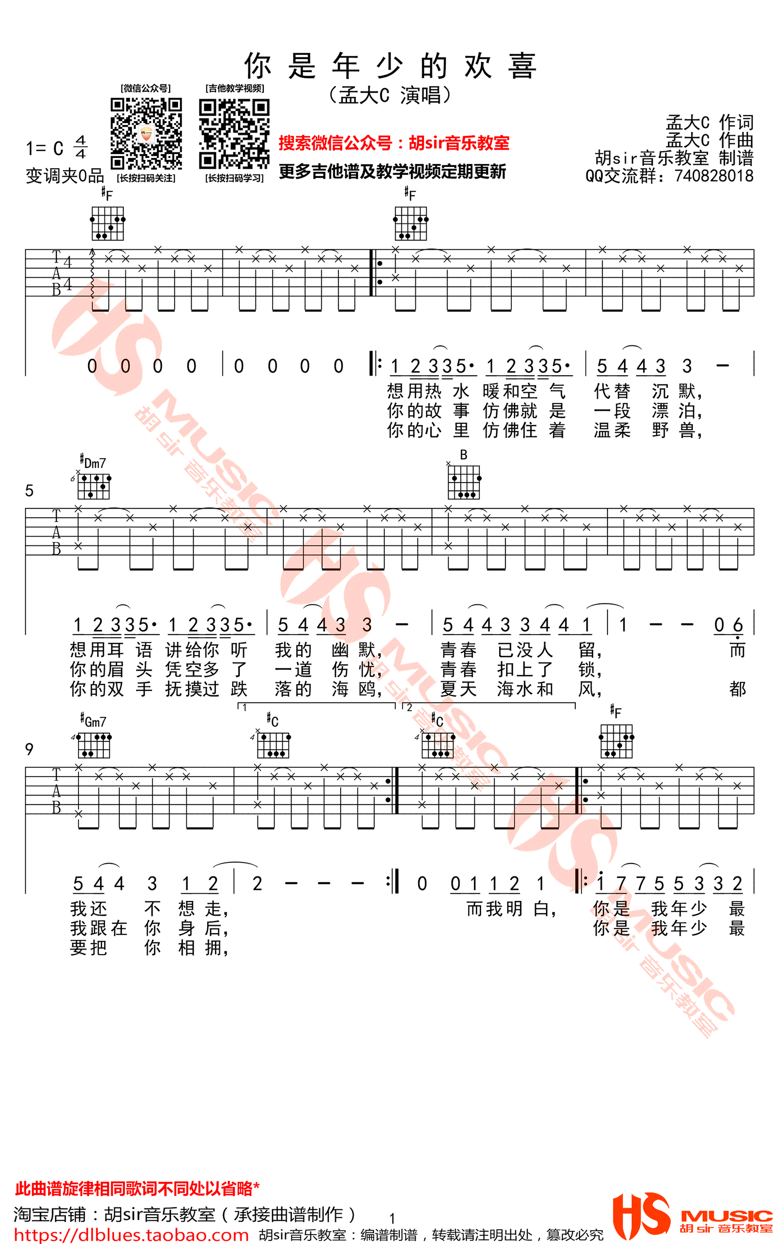 吉他《你是年少的欢喜》吉他谱_孟大C_C调弹唱谱六线谱