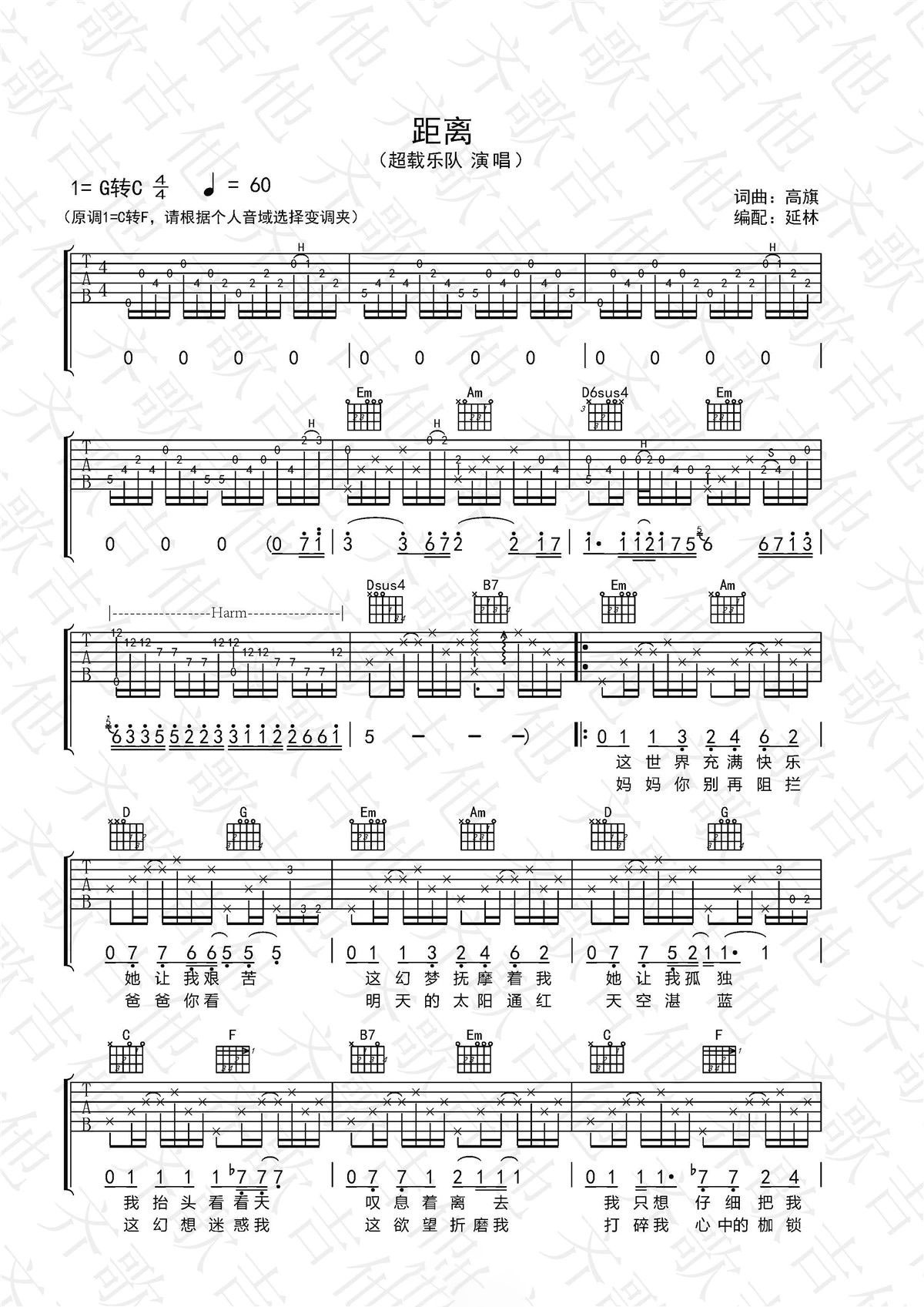 距离吉他谱_超载乐队_《距离》G调原版弹唱谱六线谱...